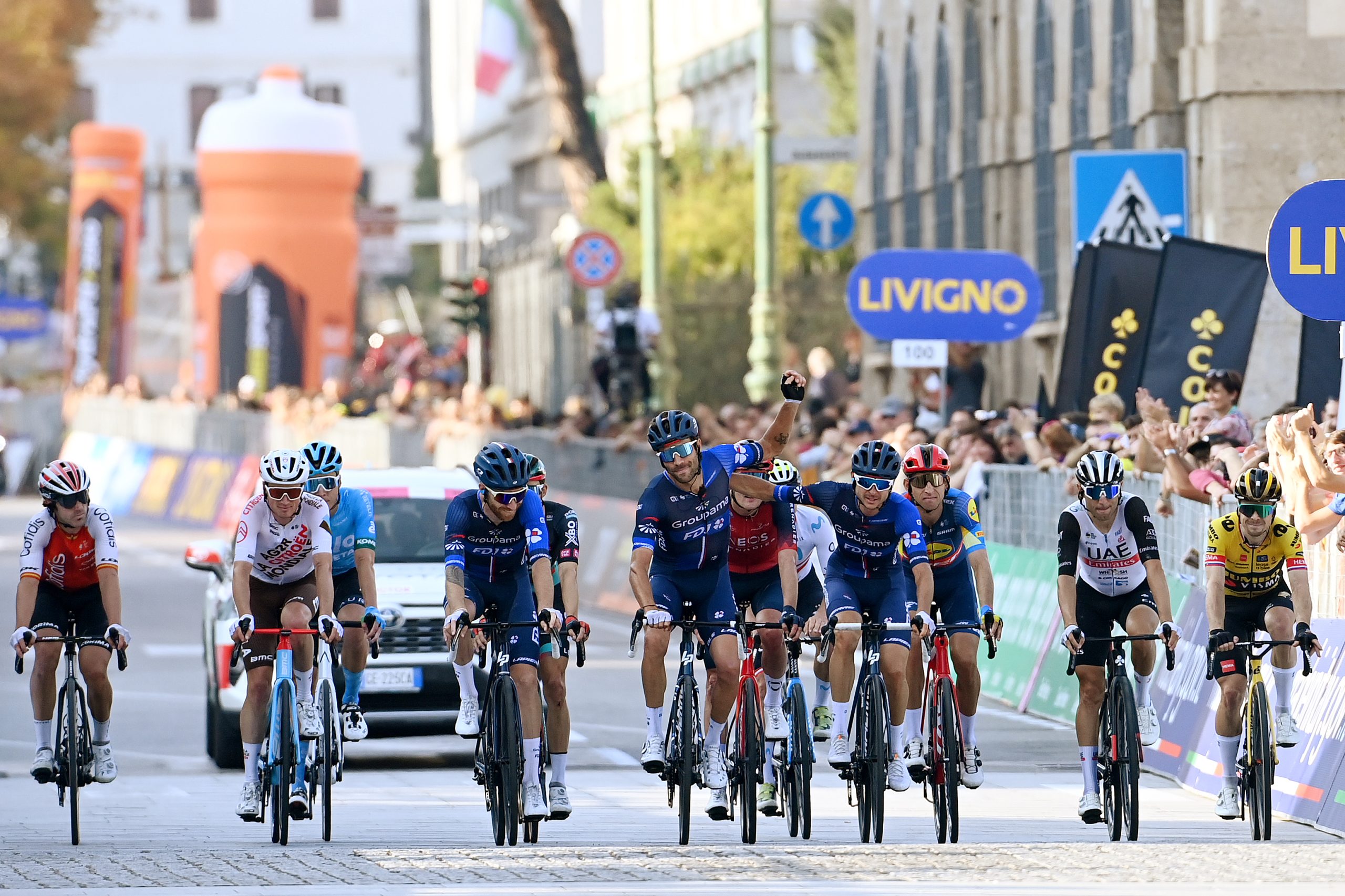 The day promised to be emotional, but it undoubtedly exceeded all expectations. Although it didn’t suit his personality at all, Thibaut Pinot was the centre of attention on Saturday, for the last race of his career. Not the most comfortable with this situation, the 33-year-old Frenchman first received a standing ovation on the podium at the start, in Como, before being honoured by the race and by his peers as he was invited to position himself at the head of the bunch for the neutral start. Then, the first kilometres of racing, during which a large breakaway developed, allowed the Groupama-FDJ climber to receive many greetings. “Many riders congratulated me, and I am actually surprised, because in the peloton as in life, I am quite wild and shy,” he said. “It was a very special day, but we tried to stay focused as much as possible and not get overwhelmed by emotion,” added Rudy Molard. “We tried to make the most of this day with Thibaut while remaining focused on the race,” said Valentin Madouas. “It is still a Monument, and it must be respected.” On the race side, the decision was made gradually, and a first big selection took place in the sequence of Passo della Crocetta and Zamba Alta, around sixty kilometres from the finish. The peloton was then made up of around fifty riders, including Valentin Madouas, Rudy Molard, Quentin Pacher and Thibaut Pinot. After a long descent, it was finally in the Passo di Ganda that everything exploded. The favorites’ fight really started, Tadej Pogacar managed to go solo on the descent while the Groupama-FDJ riders were unable to join in the big battle.
