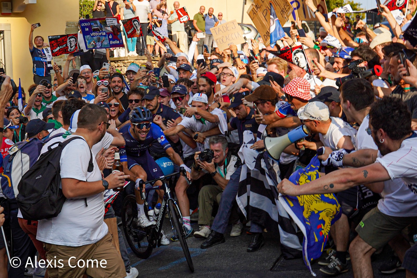 However, the race was far from over for them, in particular for Thibaut Pinot. A very last appointment awaited the rider from Melisey, in the Colle Aperto, on the heights of Bergamo, just three kilometres from the finish. More than half a thousand people, mainly travelling from France for the occasion, had gathered in the “Curva Pinot” for several hours to celebrate, honour, and greet their idol one last time. From the morning procession towards this new place of pilgrimage to the riders’ arrival, the atmosphere and the songs never died down. Yet, the best moment was yet to come. The fans first saw Pogacar heading towards the final victory, then celebrated Valentin Madouas (26th) a little later, before Thibaut Pinot, still alongside Rudy Molard and Quentin Pacher, appeared in this piece of the course dedicated to him. The noise increased tenfold, the path of the riders narrowed, and with a broad smile, the man from Haute-Saône came through the crowd, practically escorted by the hundreds of fans. “It was a lot of emotion,” said Thibaut. “I had a few questions before coming here, but in the end, I won’t regret it because it was a great party. I will think about this special day very often. I didn’t expect there would be so many people. It was real chaos, a real mess just the way I like it. It was crazy and it was a really intense moment. The videos will be incredible.”