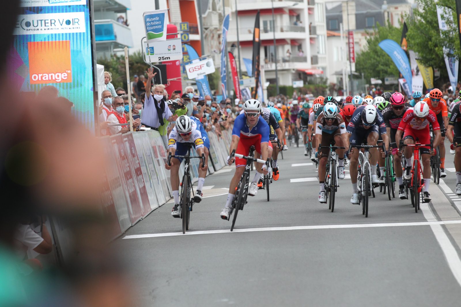 Quatre jours après son sacre à Grand-Champ, Arnaud Démare enfilait pour la première fois son nouveau maillot de champion de France en compétition, ce jeudi, à l’occasion de la première étape du Tour du Poitou-Charentes en Nouvelle-Aquitaine. Au lendemain de sa médaille d’argent au championnat d’Europe à Plouay, le sprinteur picard a d’abord pu profiter d’un début d’étape relativement tranquille lors duquel un duo s’est échappé. Immédiatement, ses coéquipiers se sont positionnés en tête de peloton et cette première échappée a été revue après cinquante kilomètres avant qu’un trio ne reparte à l’offensive. « On a surtout fait rouler le jeune Hugo Page, en provenance de la Conti, expliquait Frédéric Guesdon. Il a été aidé sur la fin par Kono pour reprendre l’échappée. On avait gardé les cinq autres pour le sprint ». Au contrôle du peloton durant l’entièreté de la journée, la Groupama-FDJ a donc laissé l’avantage du trio culminer à cinq minutes aux alentours de la mi-course avant de progressivement faire son retard et opérer la jonction à dix bornes du but. S’est alors préparé le sprint.