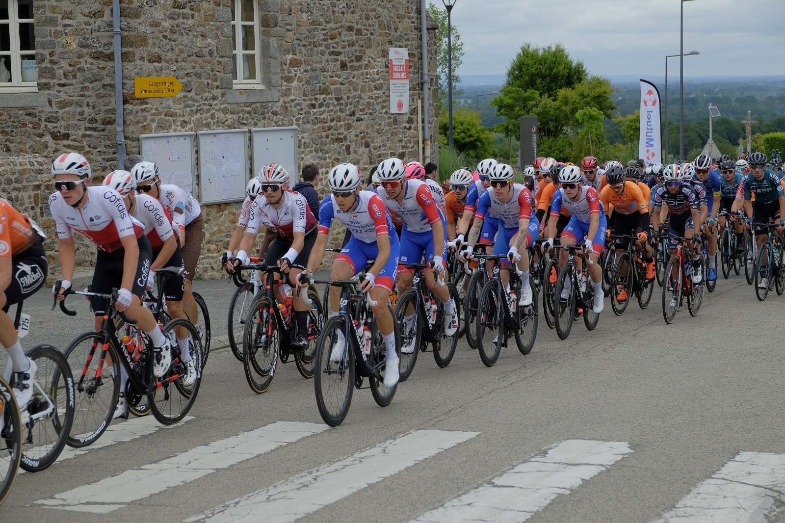 C’est un terrain casse-pattes, comme de coutume en Mayenne, qui ouvrait les hostilités ce jeudi de Saint-Pierre-des-Landes à Andouillé. Si aucune ascension de plus de trois kilomètres ne figurait au parcours, pas moins de 2000 mètres de dénivelé était tout de même au programme. Pour autant, un sprint restait l’option privilégiée au terme des 180 kilomètres de course. L’échappée du jour, articulée autour d’Arjen Livyns (Bingoal-Pauwels Sauces-WB), Angel Madrazo (Burgos-BH), Lindsay De Vylder (Sport Vlaanderen-Baloise), Joseph Rosskopf (Human Powered Health), Eugenio Sanchez (Equipo Kern Pharma) et Maël Guégan (Team U Nantes Atlantique), a d’abord jouit d’une avance de 4’30, avant que celle-ci ne soit progressivement, et inexorablement, abaissée par le peloton. « C’est le scénario qu’on avait imaginé, indiquait Yvon Madiot. Les gars ont toujours été placés, sérieux et bien concentrés sur leur tâche ». À moins de trente-cinq kilomètres du but, les coureurs ont franchi une première fois la ligne d’arrivée avant d’effectuer deux boucles autour d’Andouillé. Malgré un circuit quelque peu bosselé, le paquet est resté compact et a finalement repris le dernier échappé à sept bornes du but. « On voulait faire le sprint avec Bram, avec Paul et Fabian pour l’emmener, expliquait Yvon. On avait divisé l’équipe en deux pour l’occasion. On savait qu’il n’y avait pas d’équipes capables d’emmener de très loin, donc on ne voulait pas mettre en place un train trop important. Trois mecs suffisaient, puis Lewis et Jake pouvaient suivre les attaques dans les bosses. Il n’y en a finalement pas eu ».