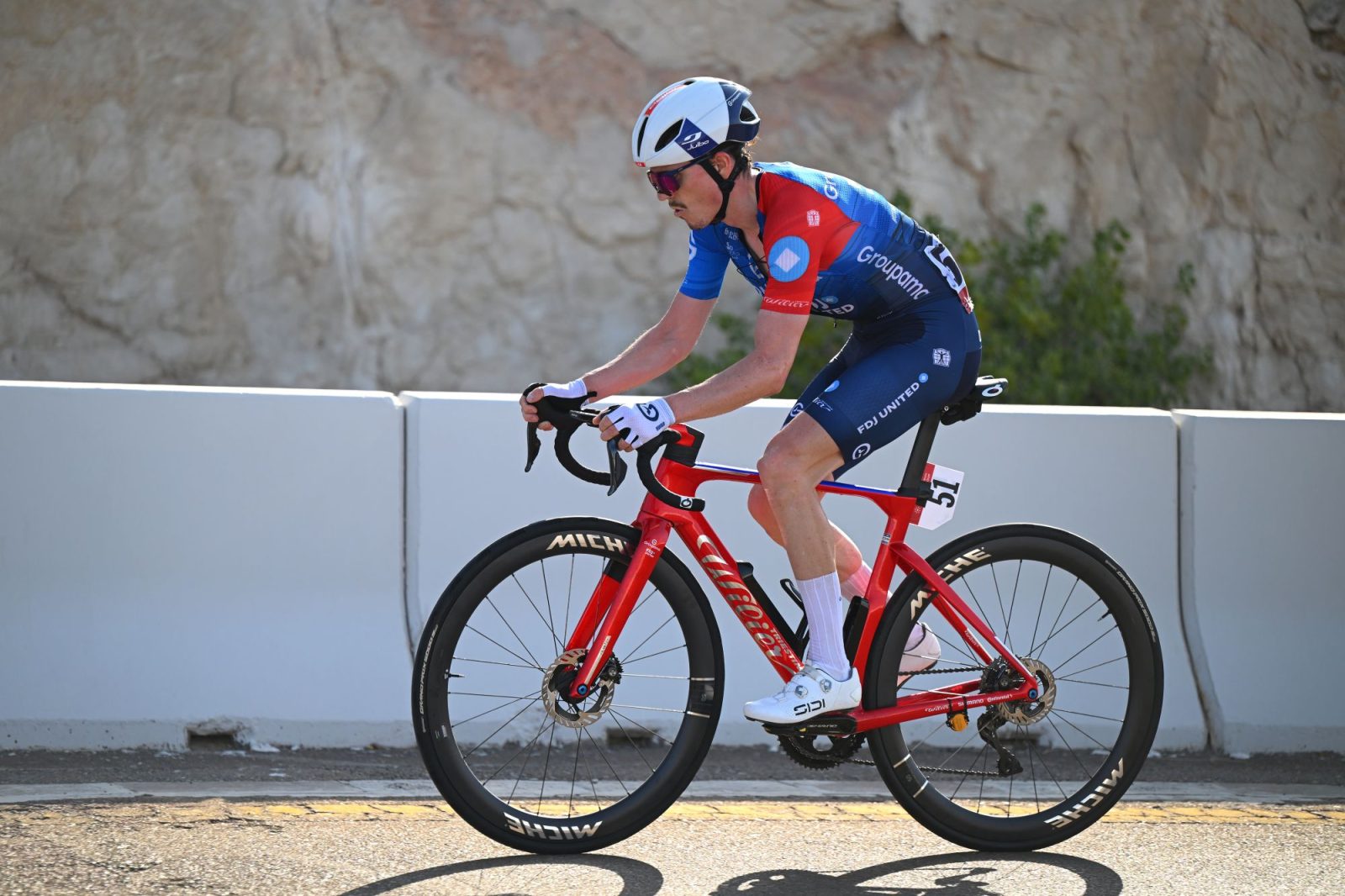 À l’instar de mercredi lors du premier rendez-vous au sommet à Jebel Mobrah, le programme du jour était relativement limpide ce samedi pour la sixième étape de l’UAE Tour : plus de 150 kilomètres de plat, puis l’ascension finale. Cette fois-ci, c’est la traditionnelle montée de Jebel Hafeet (10,6 km à 7%) qui attendait les coureurs, mais avant cela, le départ a été relativement mouvementé et neuf hommes ont pu se glisser à l’avant, dont Johan Jacobs et Axel Huens pour le compte de la Groupama-FDJ United. « La consigne était de prendre l’échappée, et même si on savait qu’elle avait peu de chances d’aboutir, cela servait pour entretenir une bonne dynamique, travailler pour la suite, et se préparer à d’autres échéances où l’échappée pourrait avoir plus de réussite, expliquait Stéphane Goubert. En avoir deux sur neuf, c’était parfait ». Si le duo franco-suisse, notamment accompagné de Joshua Tarling, n’a jamais bénéficié d’une large avance en tête de course, il a malgré tout pu garder les rênes jusqu’au pied de l’ascension finale, avant de subir les pentes à plus de 8%.