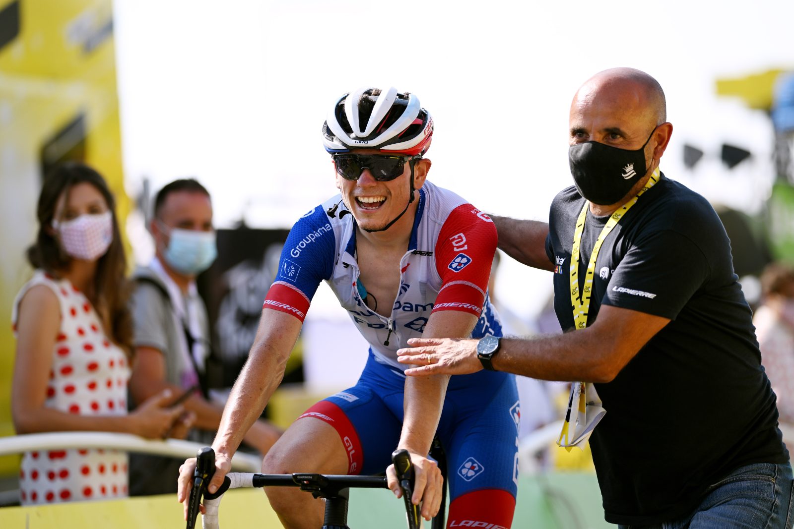 Un dernier gros morceau avant la dernière ligne droite vers Paris. C’est sans doute ainsi qu’une majorité de coureurs appréhendait la dix-huitième étape du Tour, dans les Pyrénées, depuis Lourdes jusqu’à Hautacam. L’apparition d’une échappée aura toutefois tardé, comme de coutume, et le peloton dût encore batailler pendant une soixantaine de kilomètres avant que les choses ne se tassent quelque peu, dans les premières pentes du Col d’Aubisque, première difficulté du jour (17 km à 7%, Hors Catégorie). Alors présent dans un large groupe d’échappés, Valentin Madouas se voyait rejoint par Thibaut Pinot, parti en contre depuis le peloton. Un semblant de calme n’est revenu qu’à la mi-ascension, et alors que le duo français accompagnait les meilleurs fuyards dans le col, David Gaudu retrouvait lui ses cinq autres coéquipiers dans un groupe maillot jaune pourtant réduit à peau de chagrin. « Quand on voit qu’on en a deux dans l’échappée et six dans le peloton en haut de l’Aubisque, c’est quand même pas mal », lançait fièrement Marc Madiot plus tard. « Les gars ont assuré aujourd’hui, ajoutait Philippe Mauduit. Je pense que ça a contribué à sécuriser David ». Au sommet de l’Aubisque, Thibaut Pinot est alors passé en deuxième position et s’est ensuite attaqué au Col de Spandelles (10 km à 8,3%) en compagnie de Valentin Madouas et d’une dizaine d’autres échappés, avec une marge proche des quatre minutes sur le maillot jaune.