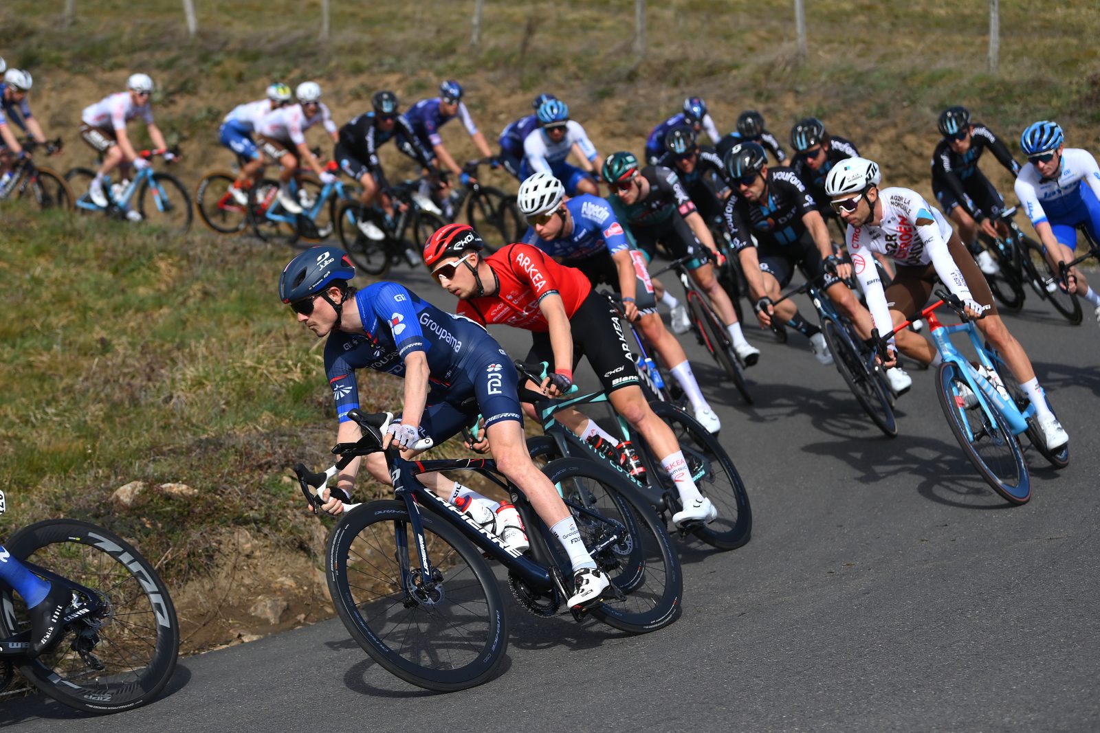 Le profil du départ aurait pu permettre une petite bagarre en début de journée, ce jeudi sur Paris-Nice. Il n’en a rien été. Malgré quelques pentes, seuls deux hommes se sont extraits après une poignée de secondes, et le peloton s’en est immédiatement désintéressé. Sandy Dujardin (TotalEnergies) et le porteur du maillot de meilleur grimpeur Jonas Gregaard (UnoX) sont ainsi partis pour un long périple en tête de course. Un périple néanmoins plus long pour le Français que pour le Norvégien, qui s’est finalement relevé après à peine cinquante kilomètres et le passage des trois premières difficultés. En tête, l’unique rescapé a pu bénéficier d’un avantage maximal de six minutes mais le peloton a aisément géré son affaire avant de le réintégrer à près de 90 kilomètres du but. « Les conditions météorologiques ont dicté la loi au peloton aujourd’hui, expliquait Philippe Mauduit. Il y avait plus de deux-cents kilomètres plutôt rectilignes, et avec un vent plutôt de face. Cela a un peu découragé ceux qui ont l’habitude de se glisser dans les échappées, mais il ne fallait pas trop s’attendre à un autre scénario ». De fait, la journée a été relativement calme dans le peloton pendant une bonne partie du parcours. Pour autant, la tension s’est succinctement accentuée, une première fois à soixante kilomètres de la ligne, à l’approche du sprint bonification situé au sommet d’une bosse de 3500 mètres à 4,5%.