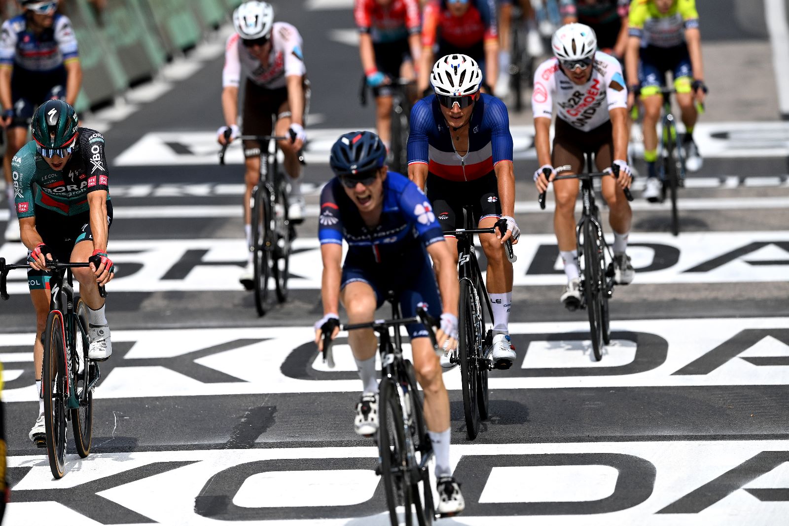 Contrairement à la veille vers Bordeaux, l’échappée était très prisée ce samedi vers Limoges, et la physionomie du départ a de fait été drastiquement différente. Une vive lutte et de nombreuses offensives ont donc eu lieu depuis Libourne, mais finalement, ils n’ont été que trois à obtenir le bon de sortie tant convoité, après vingt kilomètres : Tim Declercq (Soudal-Quick Step), Anthony Delaplace (Arkéa-Samsic) et Anthony Turgis (TotalEnergies). « On a abordé l’étape en se disant qu’il pouvait y avoir deux scénarios possibles : une grosse bagarre au départ pour prendre l’échappée, auquel cas on aurait droit à une échappée de costauds, ou un sprint final, exposait Philippe Mauduit. C’est la deuxième option qui a été retenue par le peloton ». Les équipes de sprinteurs, en particulier, se sont amplement contentées du scénario, et ont donc fait barrage une fois le trio détaché. « On s’attendait peut-être à ce que la course soit davantage mouvementée, auquel cas j’aurais pu m’inscrire dans celle-ci, mais quand on a vu qu’il n’y avait que trois coureurs devant, on a préféré rester au sein du peloton avec David pour le protéger », récapitulait Quentin Pacher. Le paquet a ainsi muselé les hommes de tête à cinq minutes, puis s’est logiquement et inexorablement rapproché dans une deuxième moitié de course plus casse-pattes. Comme de coutume, la tension s’est accrue dans les cinquante derniers kilomètres, et cela de manière très nette avant les deux dernières côtes situées dans le final.