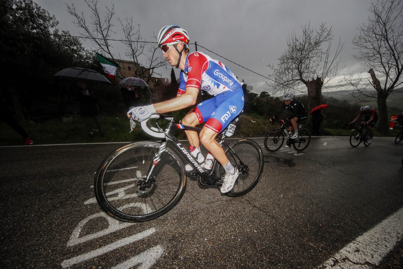 Les conditions au départ de la cinquième étape de Tirreno-Adriatico étaient quelque peu trompeuses au regard de ce qui se profilait pour les coureurs ce dimanche. « On est partis en bord de mer, avec des températures clémentes, un vent plutôt favorable et le départ a été très rapide », resituait d’ailleurs Sébastien Joly. Si rapide que l’échappée du jour n’a pu se former qu’après la première heure de course, couverte à plus de … 55 km/h de moyenne ! « Ça a bien lancé la journée », souriait plus tard Rudy Molard. Cinq coureurs parvenaient malgré tout à prendre les devants, dont le champion du monde du contre-la-montre Filippo Ganna. Dès la mi-parcours toutefois, c’est une toute autre course qui a débuté sur le circuit très accidenté de Castelfidardo. « Très rapidement, la pluie, le vent et le froid se sont invités, indiquait Sébastien Joly. Les conditions sont devenues vraiment extrêmes ». Ce qui n’a pas empêché Valentin Madouas de tenter sa chance dès la première boucle, à plus de soixante-dix kilomètres de l’arrivée. « On voulait avoir un coup d’avance sur les meilleurs, exposait Sébastien. Sauf que les meilleurs ont dégainé très rapidement. Valentin a bien joué le coup mais la grosse bagarre s’est déclenchée dans la foulée avec Van der Poel ».
