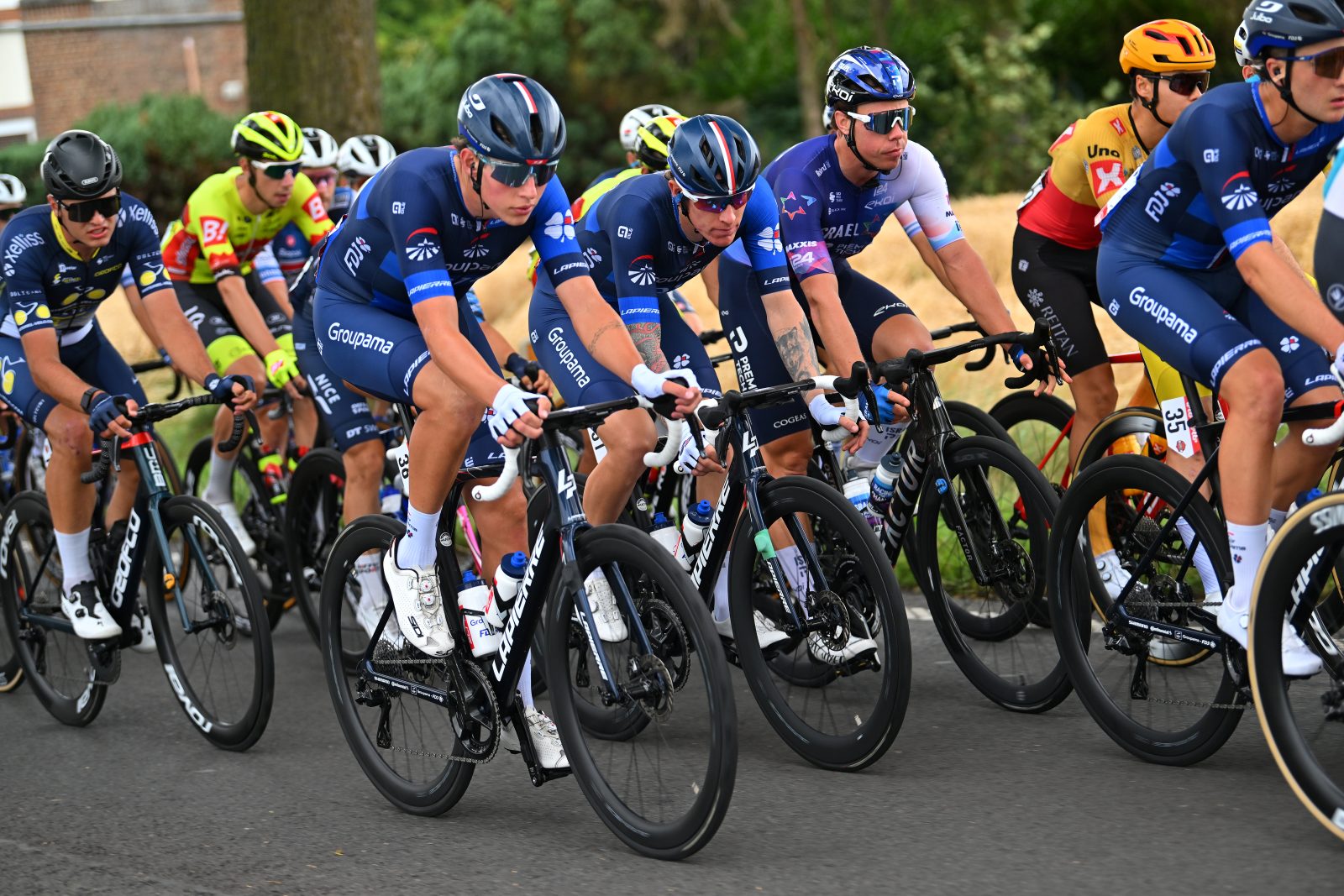 Sur le papier, la troisième étape du Tour de Wallonie proposait moins de dénivelé que les deux premières. En revanche, le profil des ultimes kilomètres laissait présager un emballage plus décousu et moins accaparé par les purs sprinteurs. Car malgré quelques jolies côtes dans la première moitié du parcours ce lundi, il n’a jamais été question d’une course de mouvements. Tord Gudmestad (Uno-X), Johan Meens (Bingoal WB) et Alex Colman (Flanders-Baloise) se sont échappés peu après le départ officiel de l’étape, et le peloton a tranquillement laissé faire, au point de voir l’écart grimper à sept minutes après cinquante kilomètres. Partie sans Miles Scotson, touché au coude, au dos et aux cervicales à la suite d’une chute dimanche, l’Équipe cycliste Groupama-FDJ s’est dans un premier temps contentée de suivre l’allure imprimée par les équipes de sprinteurs. « On était bien organisés toute la journée, insistait Jake Stewart. On savait que cette étape me convenait, donc tout le monde était très motivé et on a couru bien groupés ». Après une chasse progressive, les fuyards du jour ont été repris relativement tôt, à plus de quarante kilomètres du but. Quelques minutes plus tard, la tension est montée en flèche dans le peloton. « Sur une grande ligne droite avec vent de côté, les gars ont été vigilants, relevait Yvon Madiot. Bruno et Kono ont placé leurs coéquipiers devant. Il y a eu une grosse chute mais on a pu l’éviter grâce à ça. Ensuite, on est arrivés sur le circuit final qui était sinueux, un peu périlleux et étroit. J’avais de nouveau demandé aux gars de garder Jake bien placé, ce qu’ils ont fait ».