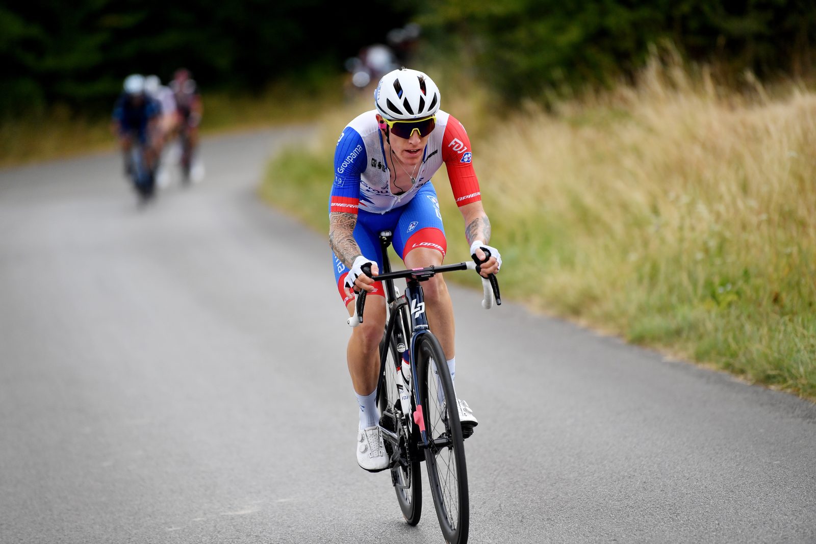 Au lendemain de la victoire de l’échappée, et en particulier d’Oier Lazkano, le Tour de Wallonie reprenait sa route ce lundi à travers un long parcours de 195 kilomètres depuis Visé jusqu’à Rochefort. L’itinéraire était encore sérieusement cabossé pour cette troisième étape, et la bagarre fut acharnée en début de course. Le peloton s’est même morcelé en plusieurs parties après une cinquantaine de kilomètres avant qu’un groupe de sept hommes ne parvienne à prendre le champ au terme de soixante-dix bornes de course. Au cœur de l’action à l’occasion de ce départ ultra-rapide, Jake Stewart réussissait alors à bondir en tête en compagnie de Ben Healy (EF EasyPost), Jorge Arcas (Movistar), Stan Van Tricht (QuickStep Alpha Vinyl), Casper Pedersen (DSM), Ivo Oliveira ainsi que Matteo Trentin (UAE Team Emirates). « On se doutait que l’étape pouvait se jouer au sprint, donc on avait plutôt misé sur lui, mais les faits de course ont fait qu’il s’est retrouvé devant, expliquait plus tard Sébastien Joly. Il était bien physiquement, il est allé dans les coups du départ et a donc pris l’échappée. C’est plutôt bon signe dans la mesure où il n’était pas bien le premier jour, que ça allait déjà un peu mieux hier, et donc encore davantage aujourd’hui. C’est une bonne chose. Néanmoins, l’échappée n’a jamais eu un gros avantage car il y avait un coureur placé au général. Il y avait peu d’espoirs ».