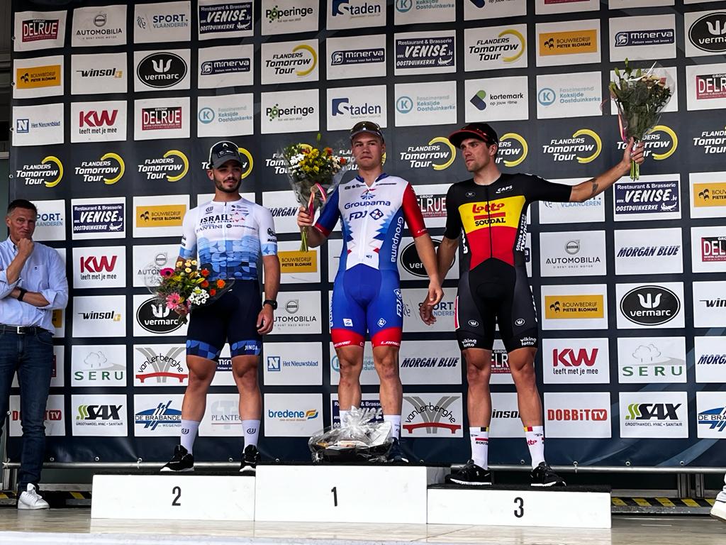 Pour sa seconde année d’existence, le Flanders Tomorrow Tour proposait un parcours très semblable à celui de 2021. Ainsi, c’est par une étape autour de Poperinge et avec la double ascension du Mont Kemmel que tout a débuté jeudi. Dans cet acte d’ouverture, une dizaine d’hommes sortie dans le final est parvenue à prendre à défaut le peloton, et notamment Jensen Plowright, vainqueur du sprint pour la treizième place. « On a été piégés et on a dû rouler, mais le groupe était parti dans le Mont Kemmel, il y avait donc des hommes forts, introduisait Jérôme Gannat. C’était compliqué de rentrer. On était un peu en-dessous physiquement le premier jour ». Le lendemain en revanche, lorsque des mouvements se sont initiés dans le final, Laurence Pithie puis Jensen Plowright ont tour à tour sauté dans le bon wagon. À cinq kilomètres de la ligne, les deux Océaniens figuraient dans un groupe de dix-huit hommes et tout semblait bien embarqué. « Jensen était de loin le plus rapide du groupe de tête, assurait Jérôme. Malheureusement, Laurence a chuté, il était en quatrième position, et les trois devant lui sont partis. Sans cette chute, il n’y a pas photo : Jensen gagnait ». Au lieu de ça, l’Australien a cette fois dû se contenter de la quatrième place, sur les talons du trio de tête. Samedi, enfin, deux demi-étapes étaient au programme du peloton avec un chrono de 12,7 kilomètres de bon matin. Eddy Le Huitouze a pris la neuvième place, alors que Enzo Paleni (14e), Laurence Pithie (15e) et Rait Ärm (17e) intégraient le top-20. « C’est une performance d’ensemble correcte, mais Eddy ou Enzo préfèrent généralement quand c’est plus long », pointait Jérôme.