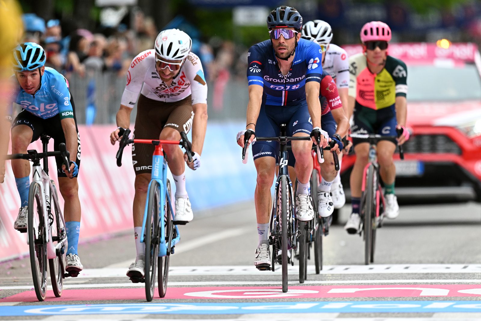 Il apparaissait clair ce samedi matin, au départ de Terni, que l’échappée avait de nouveau toutes les chances d’aboutir dans un huitième acte très accidenté dans les Marches. Comme de coutume dans ce genre de situation, la bataille pour s’y glisser a donc été extrêmement intense, et elle s’est étirée pendant près de soixante kilomètres. Malheureusement, Lars van den Berg, malade, a été contraint de quitter ses collègues avant même le départ et n’était donc pas de la partie. Alors, Jake Stewart s’est mêlé à la bagarre, y compris dans la première bosse du jour, mais c’est finalement un groupe de treize hommes qui s’est dégagé sans coureurs de la Groupama-FDJ après plus d’une heure de lutte. Ben Healy (EF Education-EasyPost), Carlos Verona (Movistar), Derek Gee (Israel-Premier Tech), Valentin Paret-Peintre (AG2R-Citroën), Toms Skujins (Trek-Segafredo), Warren Barguil (Arkéa-Samsic), François Bidard (Cofidis) Filippo Zana (Jayco-AlUla), Alessandro Iacchi (Corretec-Selle Italia), Alessandro Tonelli (Green Project-Bardiani), Mattia Bais (Eolo-Kometa), Samuele Battistella (Astana) et Oscar Riesbeek (Alpecin-Deceuninck) ont pu se construire un avantage de cinq minutes et se diriger vers les difficultés du final pour s’y disputer la victoire d’étape. La bagarre a néanmoins tourné court puisque Ben Healy a attaqué dans le premier des deux passages à I Cappuccini, à cinquante kilomètres du terme, et s’est envolé vers le succès du jour.