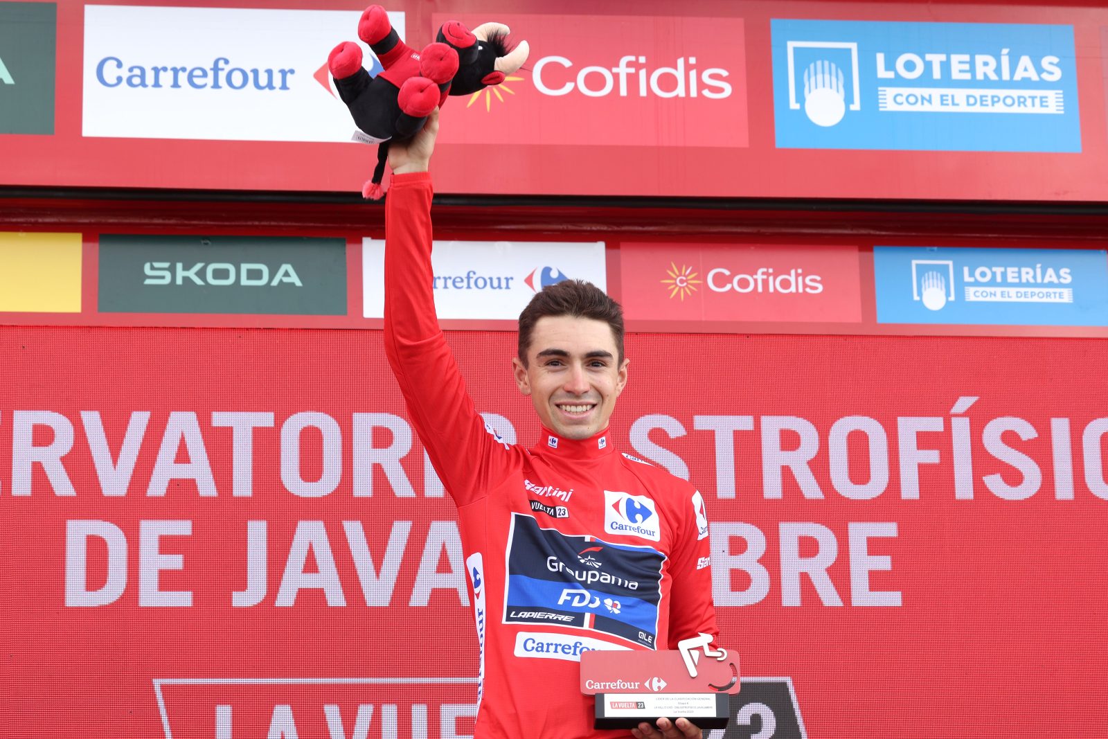 Première Vuelta, premier Grand Tour, et le voilà déjà dans les livres d’Histoire. Du haut de ses 20 ans, Lenny Martinez a fait une entrée remarquée dans les annales de son sport ce jeudi, à l’occasion de la sixième étape du Tour d’Espagne 2023, en devenant le plus jeune leader de l’histoire de l’épreuve. Membre d’une échappée fleuve, le jeune homme a pleinement profité du soutien de Rudy Molard et Michael Storer à l’avant, puis a merveilleusement conclu le travail en s’adjugeant la deuxième place au sommet du Pico del Buitre, tout en s’arrachant jusqu’à la ligne pour conquérir le maillot rouge. Aux abords de l’Observatoire de Javalambre, le grimpeur de l’Équipe cycliste Groupama-FDJ avait ce jeudi, en prenant place sur le podium, des étoiles plein les yeux. Et il n’était pas le seul. Il s’agit enfin du deuxième maillot de leader sur un Grand Tour cette saison après le rose de Bruno Armirail sur le dernier Giro.