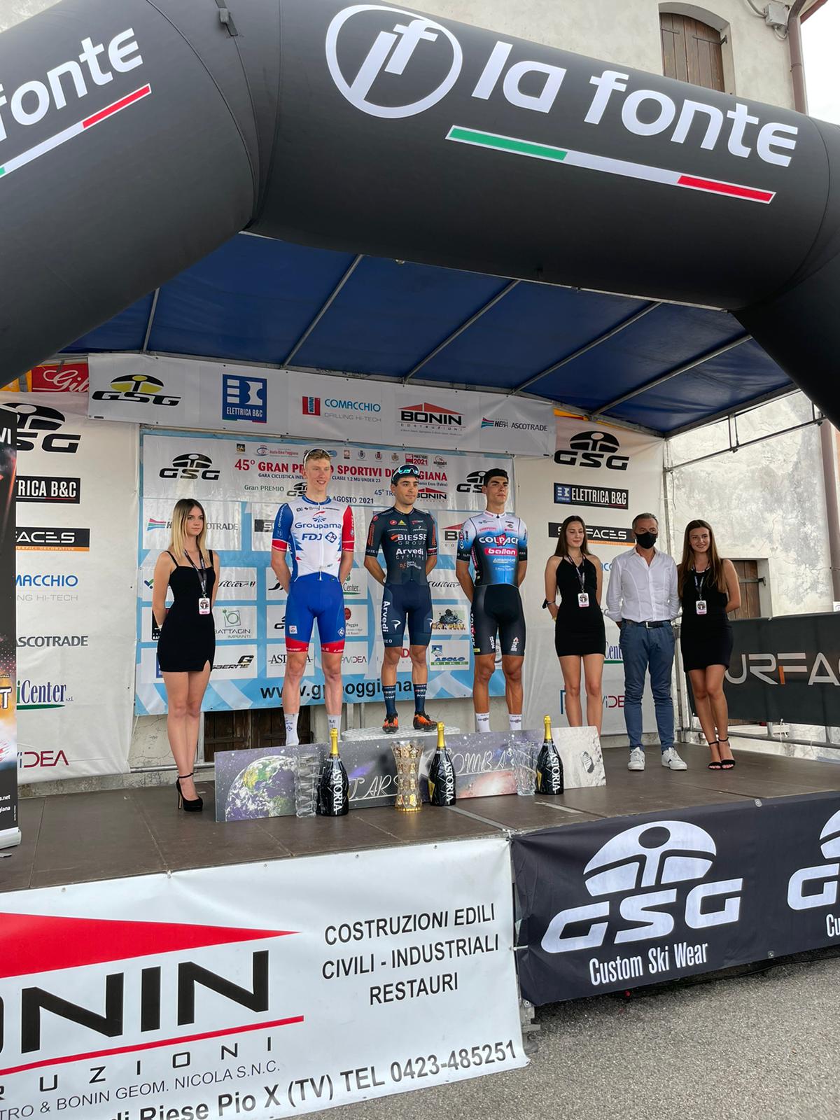 Quelques jours après sa flopée d’accessits sur le Kreiz Breizh Elites, en Bretagne, la « Conti » Groupama-FDJ avait rendez-vous dans la province de Trévise ce dimanche pour disputer une course huppée du calendrier Espoirs italien, le Gran Premio Sportivi di Poggiana. Tous les coureurs présents au « KBE » quelques jours auparavant étaient reconduits pour l’occasion, à l’exception de Marijn van den Berg, et Jérôme Gannat présentait ainsi un groupe de rouleurs-sprinteurs au départ d’une épreuve traditionnellement assez décousue. « On débutait par un circuit de soixante kilomètres en plaine avant de rencontrer une difficulté de trois kilomètres à 8%, exposait le directeur sportif de la Conti. On enchaînait avec une descente très technique et un circuit de treize kilomètres, assez vallonné sur des petites routes, à répéter quatre fois. On revenait ensuite sur la bosse précédente, mais dans l’autre sens. Il y avait enfin une dernière côte puis on terminait avec trente kilomètres de plat. Le dénivelé n’était pas énorme mais il y avait une bonne partie casse-pattes. En plus de cela, il faisait une chaleur assez étouffante ». Lors des quatre premiers tours sans obstacle autour de Poggiana, une échappée de dix-sept hommes s’est d’abord développée avec Laurence Pithie en son sein. « C’était une bonne chose d’y être représenté, car quelques équipes manquaient à l’appel et ont roulé dans le peloton, ajoutait Jérôme. Dans la première bosse, Laurence a été distancé et ils se sont retrouvés à sept devant, avec 2’30 au moment d’aborder le circuit intermédiaire ».