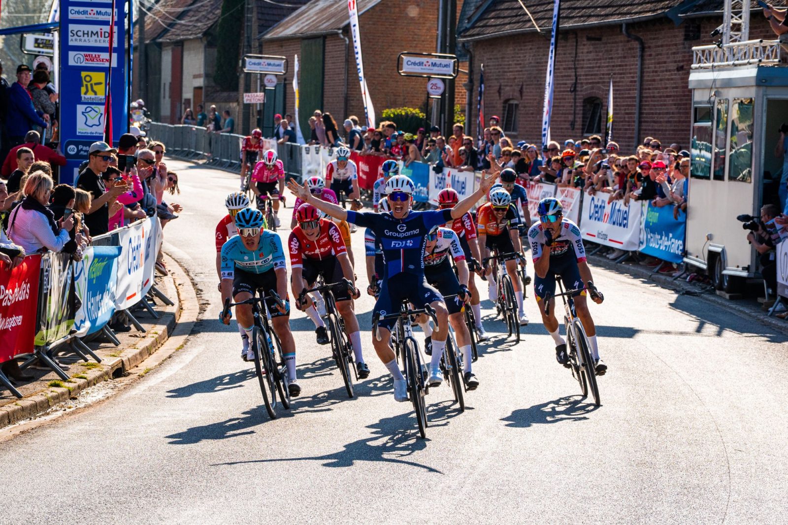 Précédemment organisée sous forme de course par étapes et réservée à l’élite des clubs amateurs de l’Hexagone, la Boucle de l’Artois se tenait cette année sur une seule journée, et accueillait pour l’occasion quelques formations professionnelles dû à son statut de classe 2. « La Conti » Groupama-FDJ était bien de la partie, pour son quatrième jour de course en équipe de la saison. Pas moins de 191 kilomètres se profilaient pour les hommes de Jérôme Gannat, sur un terrain légèrement vallonné, mais surtout très exposé. « Ça a été une course très intensive car il y avait un vent de côté presque toute la journée, exposait le directeur sportif de la formation bisontine. Ça a provoqué pas mal de cassures dans le peloton, il y a aussi eu énormément de chutes, et ça a donc été une course très dure ». Du fait de la tension palpable dans le paquet, aucune échappée n’a pu se développer pendant les soixante premiers kilomètres alors que chaque équipe comptait ses rescapés. « On a subi pas mal de chutes en début de course, avec notamment Reef et Rémi », reprenait Jérôme. À la mi-course, une chute a d’ailleurs scindé le peloton en deux, et la course n’a dès lors plus connu de moments de répit.
