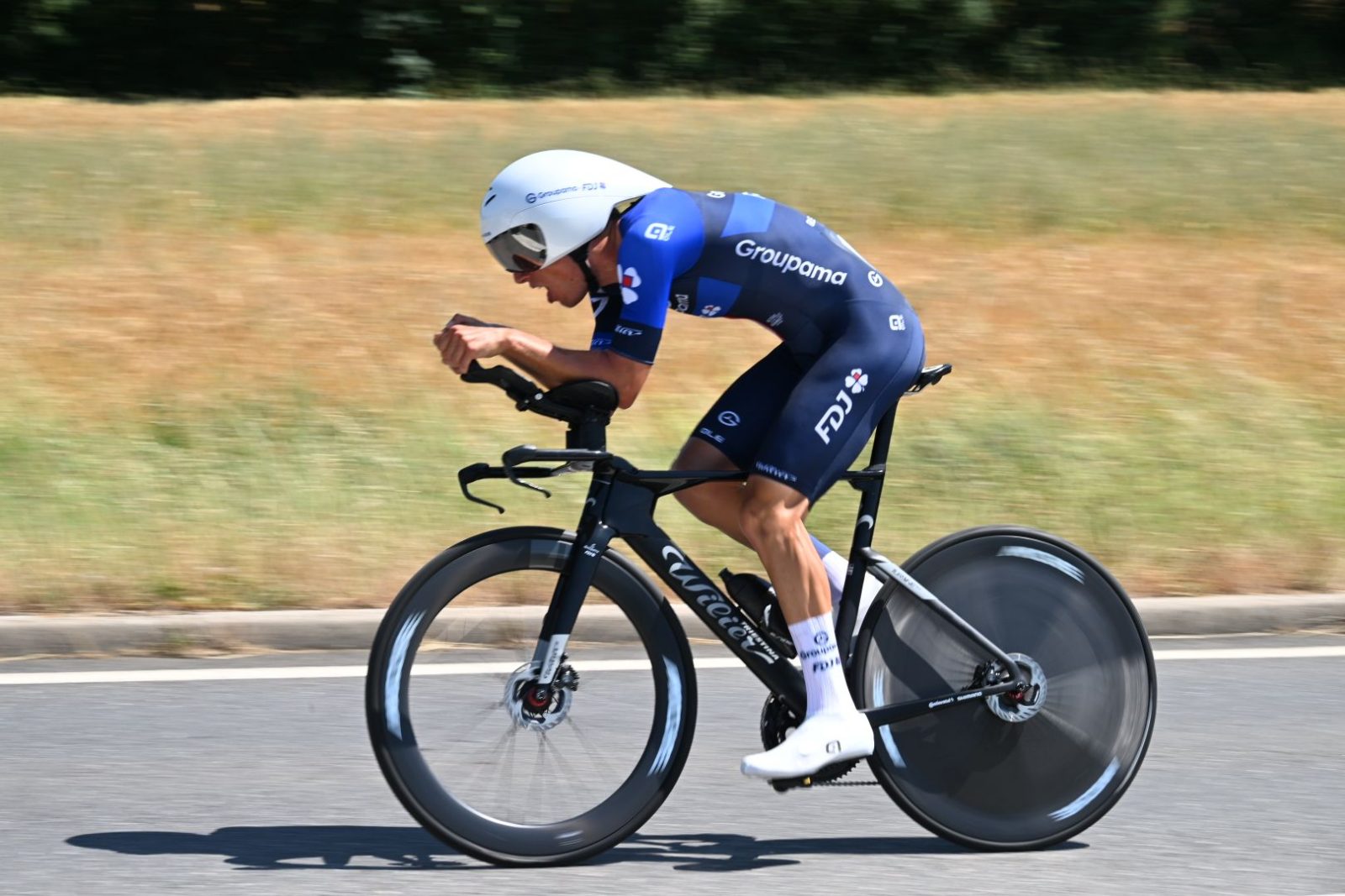 Entre Saint-Affrique et Roquefort-sur-Soulzon, la mise en route sur la Route d’Occitanie s’annonçait pour le moins pimentée ce mercredi lors du court contre-la-montre faisant office de première étape. « Il y avait d’abord une montée de cinq kilomètres à 4,5/5% de moyenne, puis une descente de trois kilomètres, et on terminait par une montée de deux kilomètres à 5% également, exposait Yvon Caër. C’était donc un parcours très physique, et un effort très spécifique. Les meilleurs ont terminé à une moyenne de 40km/h. Il fallait donc des qualités de grimpeur mais aussi faire preuve de puissance. À noter qu’en plus du parcours difficile, il faisait particulièrement chaud aujourd’hui ». Cyril Barthe a ouvert le bal pour l’Équipe cycliste Groupama-FDJ peu après 14 heures en signant un solide temps de 16’30. Tom Donnenwirth en a terminé en 16’42, Rudy Molard en 16’48, Rémy Rochas en 16’28, Kevin Geniets en 16’35, puis Lorenzo Germani et Thibaud Gruel ont été les deux derniers hommes à s’attaquer au tracé. Au final, l’Italien s’est flanqué d’une superbe marque en 15’48, tandis que son acolyte français a coupé la ligne en 16’17.