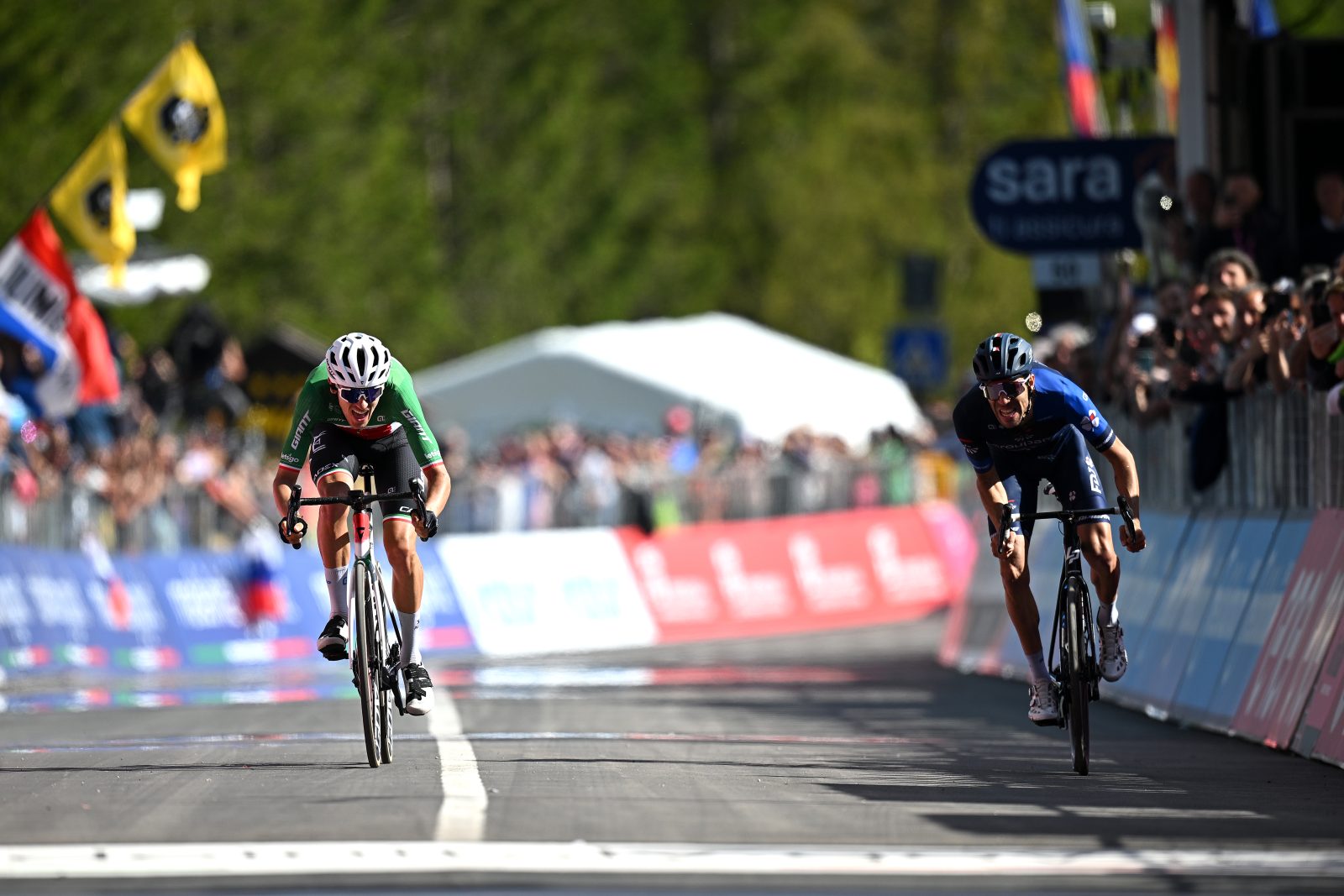 En attaquant l’ascension de Coi à une quinzaine de kilomètres du but, Thibaut Pinot faisait encore face à cinq concurrents. Mais dans les rampes les plus abruptes, le grimpeur tricolore les a décrochés un à un. À l’exception de Filippo Zana. Le champion d’Italie a tenu sa roue jusqu’au sommet, et le duo a alors dévalé une courte descente avant l’ultime remontée de deux kilomètres vers la ligne d’arrivée. La bataille pour le général s’est enclenchée parmi les favoris, mais l’écart restait largement suffisant pour se disputer la victoire d’étape. Thibaut Pinot a brièvement testé son ultime adversaire, mais c’est ensemble qu’ils sont entrés dans le dernier kilomètre pour un sprint à deux décisif. Le Français a pris ses responsabilités à 200 mètres du but, mais à cinquante mètres de la ligne, l’ombre du champion d’Italie s’est hissée à sa hauteur, puis l’a dépassé. C’est ainsi que pour la deuxième fois en moins d’une semaine, Thibaut Pinot a dû se contenter d’une deuxième place d’étape. « Dans le sprint, je fais peut-être l’erreur de lancer d’un peu loin, mais j’ai quand même moins de regrets que la dernière fois, commentait-il à froid. Je n’étais pas dans une journée exceptionnelle, et pour gagner, il me faut être dans une très grande journée. J’étais dans une bonne journée mais il me manquait un petit truc pour lâcher Zana. Peut-être qu’avec plus de confiance, je lance d’un peu moins loin et ça peut le faire. Mais avec des si… Je perds encore au sprint, mais c’est un peu moins frustrant que vendredi. J’ai donné ce que j’avais ».