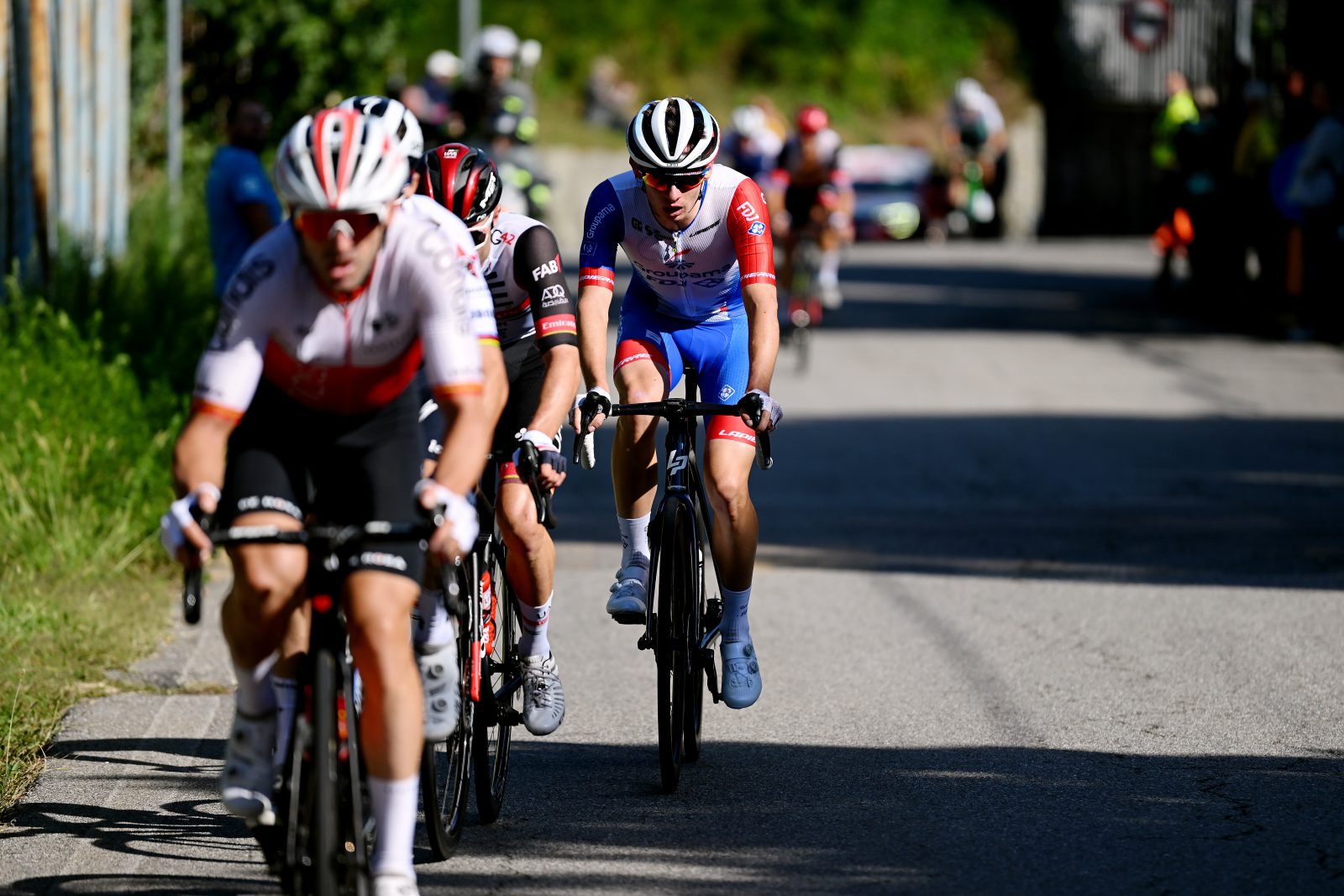 Dans la cinquième des sept boucles du circuit, l’ancien champion d’Europe Juniors s’est donc fait la malle aux côtés de l’ancien champion du monde Julian Alaphilippe mais aussi d’Ilan Van Wilder, Mikkel Honoré, Marc Hirschi, Diego Ulissi, Matteo Trentin, Miguel Angel Lopez, Einer Rubio ou encore Ion Izagirre. « Il y a eu de la course, et on a réussi à partir à quatorze, soulignait Romain, encore pensionnaire de la Conti. C’était néanmoins compliqué à gérer, car Alaphilippe était non seulement très fort, mais il y avait surtout trois Quick Step-Alpha Vinyl et trois UAE Team Emirates. Tactiquement, c’était dur à manœuvrer en étant tout seul. J’ai fait ce que j’ai pu mais ça n’a pas suffi pour organiser le groupe et espérer aller jusqu’à l’arrivée ». S’il n’a pu prendre la roue d’Alaphilippe lorsque ce dernier a accéléré dans les deux derniers passages du Piccolo Stelvio, Romain Grégoire s’est en revanche admirablement accroché et a, à chaque fois, réussi à recoller. À moins de trente bornes, neuf hommes se sont ainsi retrouvés à l’avant de la course, mais un peloton encore relativement fourni était alors sur ses talons. Le groupe a tenu tête, mais la jonction inexorable s’est finalement opérée à vingt-quatre kilomètres du but. Quelques hommes ont tenté de faire perdurer l’aventure, certains autres ont relancé, mais c’est bien un sprint qui s’est profilé pour la victoire. Davide Ballerini a réglé l’emballage peu après, Quentin Pacher s’est faufilé jusqu’en quatorzième position alors que Romain Grégoire en a terminé quelques secondes plus tard.