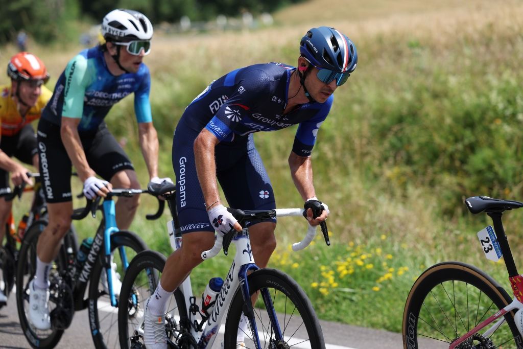 Si l’ultime étape du Tour de l’Ain affichait huit montées répertoriées au programme, le terrain ne semblait pas se prêter à des grandes manœuvres entre Lagnieu et l’Île Chambod. À compter du vingt-sixième kilomètre, c’est en réalité un long circuit d’environ soixante bornes qui était à réaliser deux fois. La principale difficulté dudit circuit résidait dans le Col de Berthiand (4,8 km à 6,2%), également dernière montée de la journée, précédant de dix kilomètres la ligne d’arrivée. « Il y avait plusieurs scénarios envisageables ce matin, exposait Rudy Molard. On a notamment tenté de se glisser dans les échappées au début mais c’est finalement un petit groupe qui est sorti, puis EF Education-EasyPost et Cofidis ont contrôlé ». Ce sont donc simplement trois hommes qui ont pris les devants, sans pouvoir se défaire de la tenaille du peloton. Rémi Lelandais, Geoffrey Bouchard et Maxime Jarnet ne disposaient même pas de deux minutes d’avance à l’entame du second tour de circuit. La meute s’est irrémédiablement rapprochée, mais c’est d’abord un duo de contre, composé de Rémi Cavagna et Maximilien Juillard, qui a revu les hommes de tête après la côte de Corveissiat. Dans la côte suivante, celle de Matafelon, Juillard est parti seul mais ne comptait plus que quarante secondes d’avance sur le peloton avant de se diriger vers l’ultime ascension.