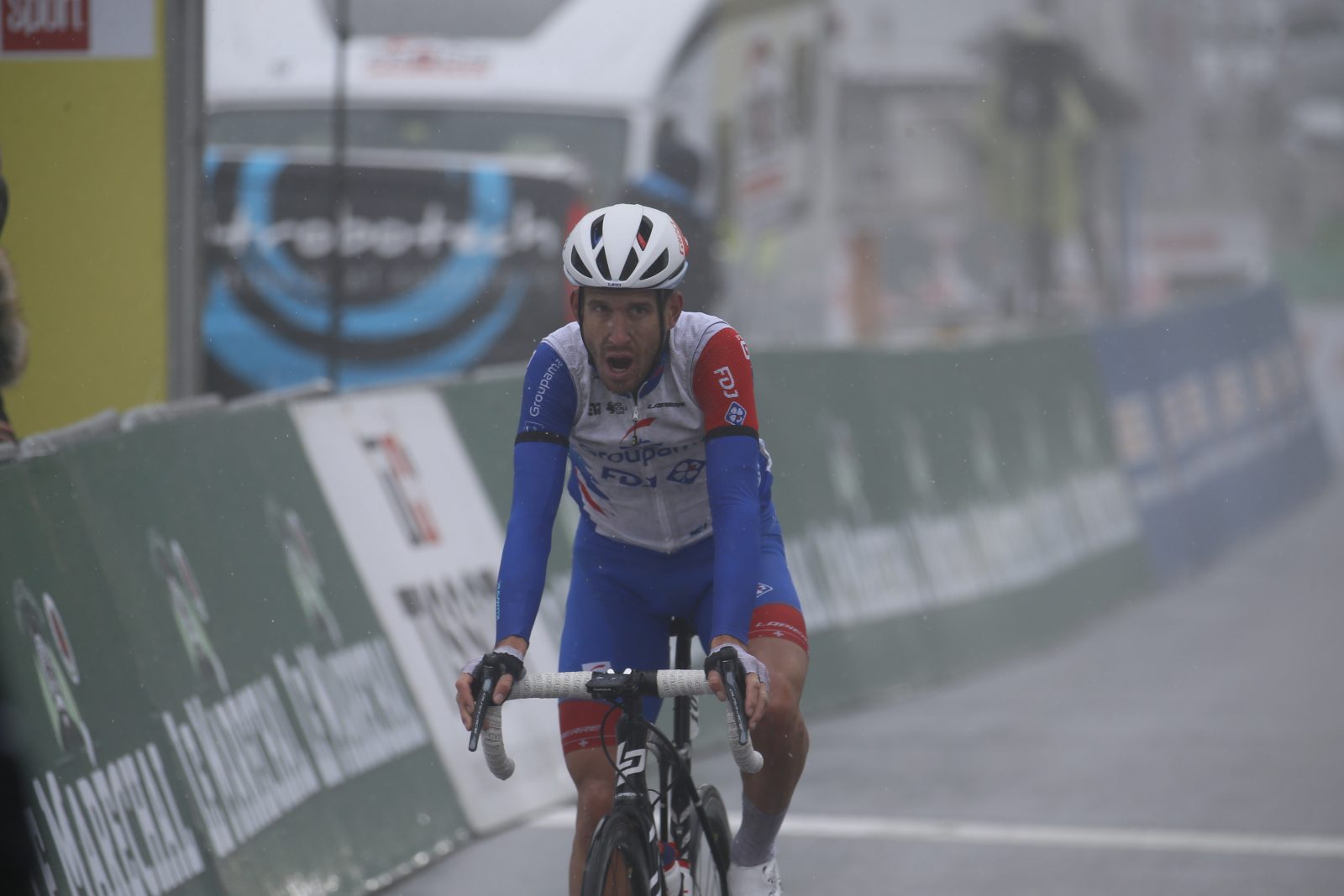 Les coureurs du Tour de Romandie n’ont pu goûter à la fête du travail ce samedi 1er mai. À l’inverse, un menu des plus copieux les attendait entre Sion et la station de Thyon 2000, avec trois jolis cols à escalader tout au long des 161 bornes du parcours. C’est néanmoins par trente kilomètres quasi-intégralement plats que la journée a débuté, et l’échappée composée de Josef Cerny (Deceuninck-Quick Step), Mads Wurtz Schmidt (Israel-Start Up Nation), Kobe Gossens, Mathew Holmes (Lotto-Soudal), Magnus Cort (EF Education-Nippo), Simone Petilli (Intermarché-Wanty Gobert) et Simon Pellaud (Suisse) en a profité pour se dessiner. « On pensait que le bon coup partirait dans les cols mais il est finalement parti sur le plat, disait Yvon Madiot. De bons rouleurs sont d’ailleurs sortis, et c’était de fait plus compliqué pour mes poids plumes. On aurait bien aimé placer l’un de nos grimpeurs devant, mais compte tenu du moment où l’échappée s’est formée, ce n’était pas évident. Au final, elle n’est pas allée au bout, ça nous laisse moins de regrets. On a ensuite attendu pour faire la meilleure montée finale possible ». Au sein du peloton, Sébastien Reichenbach et Matteo Badilatti se sont donc économisés, du moins pendant un moment. « Dans la première partie d’étape, le temps était relativement correct, reprenait Yvon. Ça a vraiment commencé à se gâter au bout de cent kilomètres environ, à l’entame du deuxième col ».