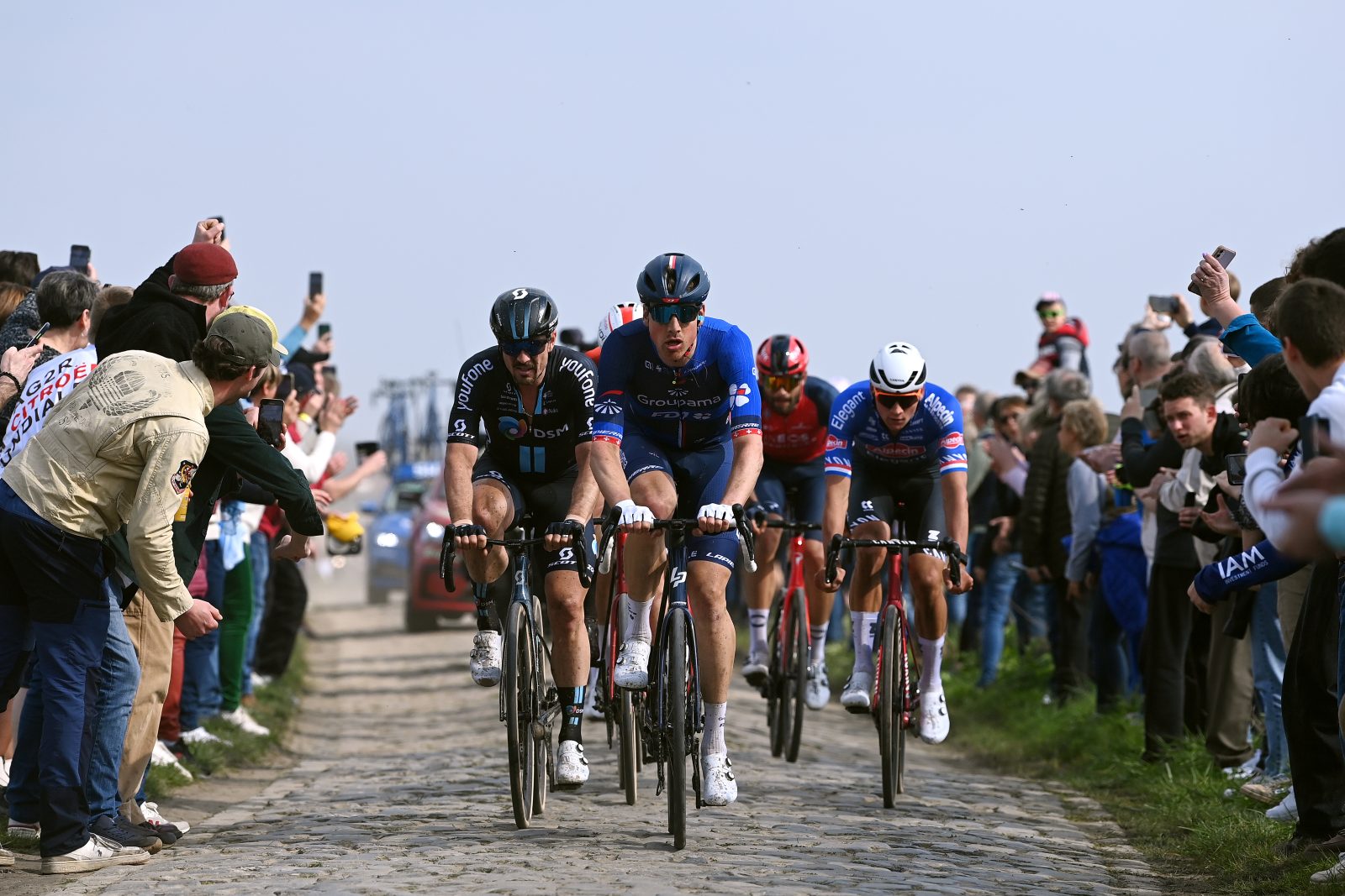 Troisième Monument du printemps, Paris-Roubaix constituait aussi, ce dimanche, le terme de la grande épopée 2023 des Classiques pavées. Et c’est donc la « Reine » d’entre elles, la plus pavée de toutes, et sans doute la plus mythique à laquelle s’attaquaient 175 guerriers, entre Compiègne et Roubaix. Un total de 54,5 kilomètres de pavés répartis sur vingt-neuf secteurs attendaient le peloton à compter du centième kilomètre du tracé, mais avant cela, nombreux étaient les concurrents à vouloir anticiper l’explication des favoris. Si nombreux qu’il a fallu patienter près de deux heures pour qu’un quatuor réussisse à s’extirper. Jonas Koch (Bora-hansgrohe), Derek Gee (Israel-Premier Tech), Sjoerd Bax (UAE Team Emirates) et Juri Hollmann (Movistar) ont de fait pris les commandes, mais n’ont en réalité jamais pris du champ. Le peloton est resté à deux minutes, contribuant, avec le concours du vent favorable, à afficher une vitesse moyenne folle sur les deux premières heures de course. « Le coup est parti quinze kilomètres avant les pavés, et vu que l’approche des pavés est toujours nerveuse, ça a finalement toujours été rapide, indiquait Frédéric Guesdon. Sur ce début de course, Miles et Jake étaient désignés pour protéger Stefan, tandis que Sam devait simplement être vigilant si un gros coup partait à l’approche des pavés ». Si quelques chutes ont émaillé les premiers secteurs, la Groupama-FDJ a été relativement épargnée dans un premier temps. En revanche, son leader helvète a été contraint de changer de vélo à 130 bornes du terme. « Il a eu un problème de tige de selle, qui s’est un peu baissée lors du troisième secteur, expliquait Frédéric. Le changement a été assez long car on était derrière plusieurs groupes. Ils ont dû changer de vélo entre eux, juste avant qu’on ne le dépanne, mais on ne s’en est pas trop mal sortis. Il y avait du monde pour l’aider et on n’a pas perdu beaucoup de temps ».