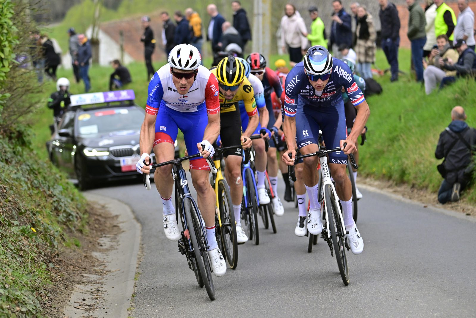 Sur une distance bien moindre à celle qui sera parcourue dimanche en direction d’Audenarde, la Classique WorldTour d’À Travers la Flandre faisait office de dernier test à quatre jours du deuxième Monument de la saison. L’action était de fait plus condensée. Or, celle-ci a été présente dès le début de course puisque la bataille pour l’échappée « matinale » s’est étendue pendant près de quarante-cinq minutes. Johan Jacobs (Movistar), Kelland O’Brien (BikeExchange-Jayco), Mathijs Paasschens (Bingoal Pauwels Sauces-WB), Nils Politt (Bora-hansgrohe) et Aaron Verwilst (Sport Vlaanderen-Baloise) ont finalement pu sortir et obtenir une belle marge de cinq minutes face au peloton. Pour ce dernier, la course a été redynamisée à l’entrée dans les cent derniers kilomètres. « On ne savait pas exactement comment ça allait se passer car c’était un nouveau parcours, il n’y avait pas forcément un seul endroit stratégique, expliquait Frédéric Guesdon. Une chose était sûre, on ne voulait pas que ça arrive au sprint. On voulait aller de l’avant, durcir, et surtout ne pas louper un bon coup. On avait simplement établi qu’une fois que cela commencerait à être nerveux, il fallait s’inscrire dans les mouvements et surtout ne pas se faire piéger. C’est pour cette raison qu’on a vu les gars assez offensifs, et on a bien fait, car la course s’est vite décantée ». Olivier Le Gac a fourni la première attaque à 90 kilomètres du but, puis c’est Lewis Askey qui s’est intercalé avec deux coureurs une dizaine de bornes plus loin. « Sur ces premiers monts, c’était à eux d’accompagner, puis Stefan, Val et Kevin devaient être présents sur le Berg ten Houte, exposait encore Frédéric. C’était le mont le plus dur, sur pavés, celui où il fallait se placer et où la course pouvait vraiment se décider. C’est ce qu’il s’est produit ».