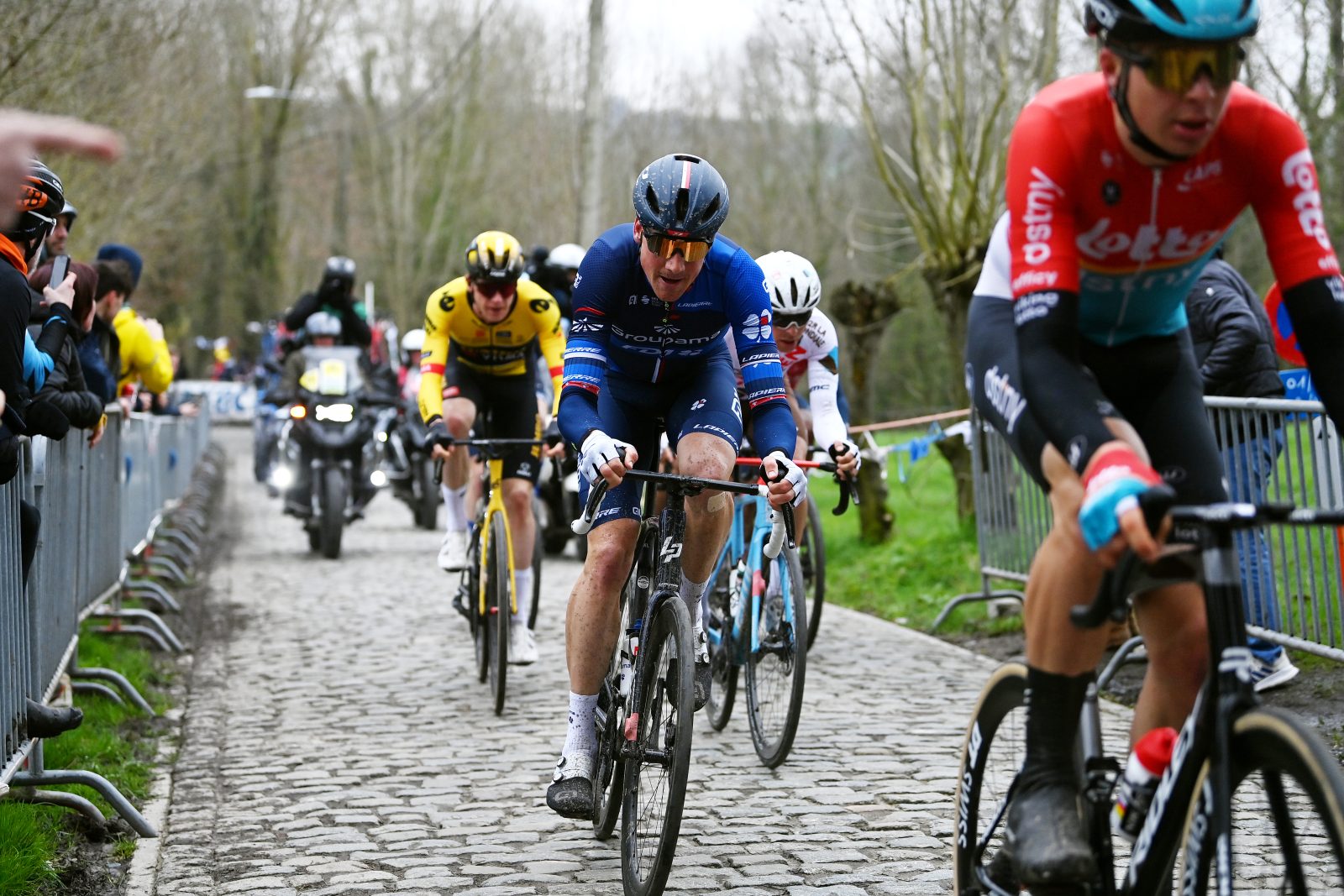 La semaine « sainte » en Belgique arrivait à son terme ce dimanche avec le deuxième Monument cycliste de la saison, et pour certains la plus belle épreuve de l’année, comme point d’orgue. Sept ans après, le Tour des Flandres retrouvait aussi Bruges, point de départ de 273 kilomètres jalonnés de dix-neuf monts et six secteurs pavés. Cent kilomètres précédaient les toutes premières difficultés, et même cent-trente étaient à couvrir avant des enchaînements incessants. Ils n’ont pourtant pas été sans remous. Après trente bornes, une bordure a ainsi piégé Valentin Madouas, Kevin Geniets et Fabian Lienhard, et si la jonction a été établie une demi-heure plus tard, le troisième du Ronde 2022 était toutefois contraint de quitter l’épreuve, affaibli par des maux d’estomac. « Il avait un peu mal au ventre ce matin et il espérait que ça irait, relatait Frédéric Guesdon. Malheureusement, c’est parti assez vite et il s’est fait distancer dans le vent. Il a tout de suite compris qu’il n’allait pas pouvoir jouer devant et il a préféré ne pas insister. On n’a pas été surpris par ce début de course, car beaucoup d’équipes voulaient devancer les costauds et mettre un mec devant. Il était donc logique que l’échappée mette énormément de temps à partir ». Alors que la Groupama-FDJ se voyait amputée de l’une de ses cartes maîtresses, l’échappée parvenait enfin à se constituer après une centaine de kilomètres. Guillaume Van Keirsbulck (Bingoal WB), Daan Hoole (Trek-Segafredo), Jasper De Buyst (Lotto-Dstny), Filippo Colombo (Q36.5) et Elmar Reinders (Jayco-AlUla) y ont d’abord pris place, bientôt rejoints par Tim Merlier (Soudal Quick-Step), Jonas Rutsch (EF Education-EasyPost) et Hugo Houle (Israel-Premier Tech).