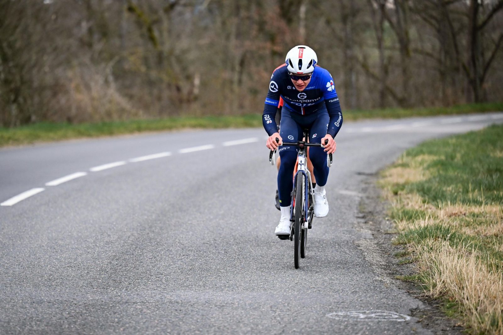 Pour la première fois dans cette édition 2025 de Paris-Nice, le peloton s’apprêtait à franchir le cap des 200 kilomètres ce jeudi. Le tout avec pas moins de 2600 mètres de dénivelé répartis entre Saint-Just-en-Chevalet et le sommet de la côte de Notre-Dame-de-Sciez. Plus spécifiquement, une demi-douzaine de côtes abruptes jalonnait les cinquante derniers kilomètres pour un final aux allures de Classique. Pour autant, il n’a pas fallu attendre l’épilogue pour assister à de l’action, car une lutte interminable pour l’échappée s’est tenue en début de course. « On savait qu’un groupe bien constitué pouvait aller très loin aujourd’hui, donc l’objectif était d’absolument mettre quelqu’un dedans, expliquait Benoît Vaugrenard. Il fallait donner le maximum pour faire la course et les coureurs ont été dans les coups dès le départ ». « C’était un départ musclé avec plus de quatre-vingts kilomètres de bagarre, donc chapeau à Thibaud d’avoir réussi à prendre l’échappée, car il fallait vraiment batailler, enchaînait Guillaume Martin-Guyonnet. Malheureusement ils n’étaient que deux, donc on se doutait que ça se jouerait entre les favoris du général ». À l’avant, le jeune Tourangeau a poursuivi son initiative bien qu’étant réaliste sur ses chances de réussite. « Ce n’était pas l’idéal, c’est sûr, confiait-il. C’était même mission impossible, mais une fois qu’on y était, il ne fallait plus trop réfléchir. Je n’allais pas me relever… »