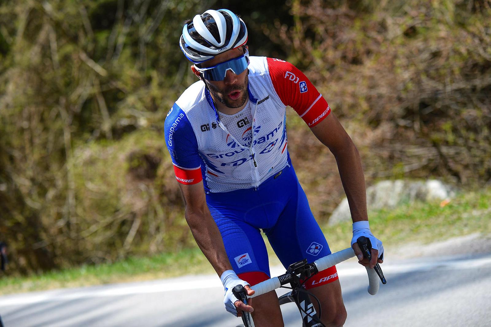 La dernière étape du Tour des Alpes, tracée ce vendredi sur tout juste 120 kilomètres, n’offrait presqu’aucune portion plate aux coureurs. La plus longue du jour s’étalait de fait sur une dizaine de bornes, dès la sortie de Valle del Chiese, où la bagarre fut intense d’entrée de jeu pour attraper le bon coup. « Il y a eu un départ rapide comme tous les jours, relatait Philippe Mauduit. L’échappée a finalement réussi à partir à la pédale dans la première bosse. Ils sont d’abord sortis à huit puis Thibaut a contré avec Fabbro derrière. Il s’est d’ailleurs bien employé pour rentrer car ça roulait vraiment à bloc ». Le Franc-Comtois a ainsi rejoint la tête de course après environ vingt-cinq kilomètres de course, et s’est notamment retrouvé avec Felix Grossschartner, Matteo Fabbro (Bora-hansgohe), Alessandro De Marchi, Dan Martin (Israel-Start Up Nation), Tony Gallopin (AG2R-Citroën), Nicolas Roche (Team DSM), Tejay Van Garderen (EF Eduction-Nippo) ou encore Hermann Pernsteiner (Bahrain-Victorious) et Ivan Sosa (Team Ineos). Du beau monde. Peut-être trop, d’ailleurs, puisque la formation BikeExchange de Simon Yates n’a jamais accordé plus de 2’30 aux attaquants. « À partir du moment où tu as des mecs bien placés dans l’échappée, tu sais que tu ne vas pas avoir tout le loisir de manoeuvrer en tête, ajoutait Philippe. Il faut simplement faire avec ».