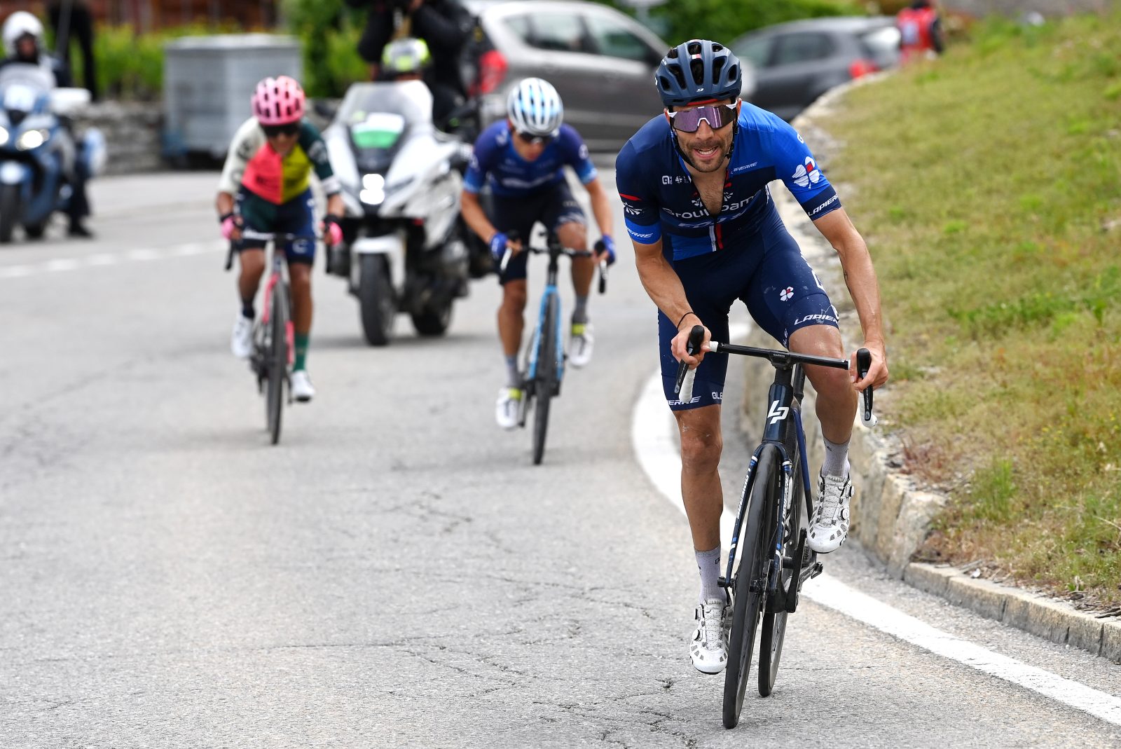 À plus de trente kilomètres de la ligne, certains ont fait le choix de ne plus collaborer au sein de l’échappée, mais Thibaut Pinot a fait pour permettre à cette dernière de poursuivre son avancée. À l’arrivée, l’écart était légèrement inférieur aux trois minutes avant les treize kilomètres à 7% de moyenne menant au sommet de Crans-Montana. Le coureur de la Groupama-FDJ a déclenché sa première offensive de bonne heure, puis a enchaîné avec une deuxième, une troisième, une quatrième, et une cinquième. À chaque fois, Alexander Cepeda et Einer Rubio, auparavant peu enclins à collaborer, sont malheureusement parvenus à recoller. « Ce n’est pas une montée spécialement difficile dans les roues, dans l’aspiration, et je ne luttais pas contre n’importe qui non plus, témoignait Thibaut. J’avais déjà fait beaucoup d’efforts dans le col précédent. C’est une belle montée mais c’est vraiment compliqué de lâcher des mecs sur des pentes à 7%, surtout quand on te laisse faire tout le travail. C’était compliqué à gérer et il n’y avait rien d’autre à faire. Si je ne roule pas, on se fait reprendre par le groupe maillot rose et on ne fait rien ». Malgré ses innombrables efforts, et une véritable volonté d’aller de l’avant, l’ancien vainqueur du Tour de Lombardie n’a pu se défaire des deux sangsues sud-américaines, bien décidées à lui laisser toute la responsabilité. Après avoir répondu à l’unique contre de Cepeda à quatre kilomètres du but, Thibaut Pinot a bien retenté sa chance, mais le trio s’est reformé pour les deux dernières bornes, moins difficiles.