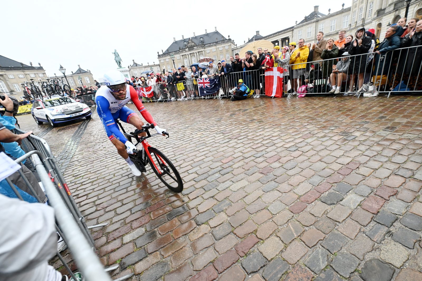 À la grande fête du vélo annoncée à Copenhague ce vendredi, pour le Grand Départ du Tour de France 2022, devait se joindre un invité de marque. L’heure de son arrivée, néanmoins, n’était pas clairement identifiée, ce qui tendait à rendre la journée indécise. La pluie, en l’occurrence, s’est finalement présentée plus tôt que prévu sur le parcours relativement technique proposé en guise de première étape. Lorsque l’épreuve a démarré sur les coups de 16 heures, la chaussée était déjà détrempée et les coureurs ayant misé sur une arrivée tardive du mauvais temps n’y ont donc finalement pas échappé. David Gaudu, premier coureur de l’Équipe cycliste Groupama-FDJ au départ, a donc dû composer avec ce facteur. Malgré une petite frayeur en cours de route, le Breton a bien limité les dégâts et surtout terminé sans toucher terre. Il a ainsi bouclé l’étape en un temps honorable de 16’07’’. « On savait qu’il y avait une probabilité de pluie, et on avait vu lors de la reconnaissance qu’il y avait pas mal de bandes blanches, indiquait David. C’est un parcours très technique, totalement urbain. On savait que ça pouvait être très piégeux. Je me suis d’ailleurs fait un petit peu peur, mais c’est passé pour ce coup-ci. Il fallait éviter la chute et tout mettre dans les lignes droites. Les sensations avaient l’air d’être plutôt bonnes et je suis content du chrono. Le Tour ne fait que commencer, on est partis sur les bons rails ». Au terme de la journée, David Gaudu a finalement concédé cinquante secondes au vainqueur Yves Lampaert et quarante-trois au premier prétendant du général Tadej Pogacar.