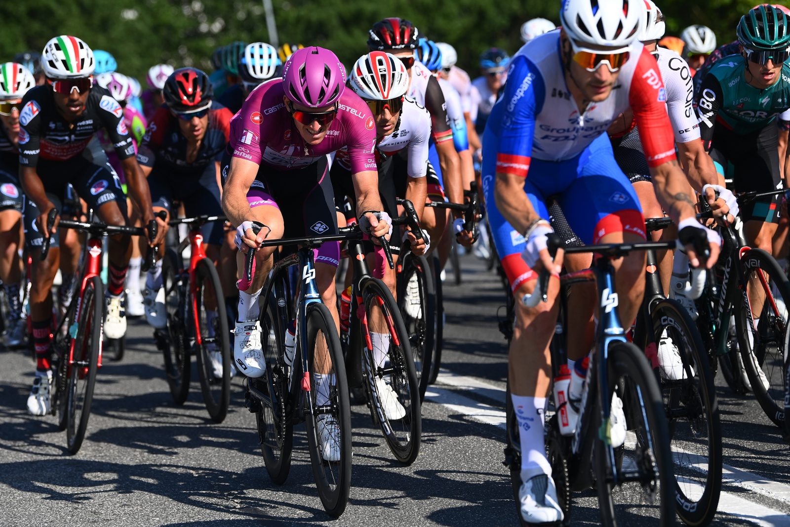 Il ne restait alors plus qu’une réelle difficulté à franchir, à Monsano, où les 1700 derniers mètres affichaient un pourcentage moyen de 6%. Extrêmement bien replacé par Tobias Ludvigsson et Jacopo Guarnieri au pied, Arnaud Démare s’est donné les moyens de jouer sa carte pleinement. « Physiquement, j’étais vraiment bien, soutenait-il. On s’est accrochés pendant longtemps. Dans le dernier talus, ça a vissé fort et il ne manque vraiment pas grand-chose… Il doit me manquer 30 secondes pour espérer basculer avec le peloton ». À la suite d’un énorme tempo de la formation Ineos Grenadiers mais aussi de diverses attaques, le paquet a finalement atteint le sommet avec une petite trentaine de coureurs seulement en son sein. Arnaud Démare, décroché à un kilomètre de ce même sommet, a basculé quelques instants plus tard, mais la course n’a plus offert un moment de répit. « On ne s’est pas relevés, on a tenté de revenir et on a roulé jusqu’au dernier kilomètre, disait-il. On n’a rien lâché jusqu’à la ligne, on ne savait pas si ça pouvait se relever devant. On ne finit qu’à une minute, ce qui n’est pas très loin. Je suis un peu déçu, mais les jambes étaient bonnes malgré tout. Ça allait bien aujourd’hui. Il n’a pas manqué grand-chose ». En tête de course, c’est l’Erythréen Biniam Girmay qui a alors réglé un groupe un peloton très réduit, devant Mathieu van der Poel. Grâce aux vingt-cinq points récoltés, il s’est rapproché à trois unités du maillot cyclamen toujours porté par Arnaud Démare ce mardi soir. « On sait que Girmay se rapproche vraiment très fort, ajoutait Arnaud. Ça va être un beau challenge et un beau spectacle. Il va être un gros client pour le maillot, mais notre objectif était surtout l’étape de demain ». « Comme on se le disait ce matin encore, l’objectif principal reste les victoires d’étapes, ponctuait Sébastien Joly. Si on gagne, le maillot viendra naturellement ». Mercredi, le Giro se rendra à Reggio Emilia au terme de 203 kilomètres sans une once de relief.