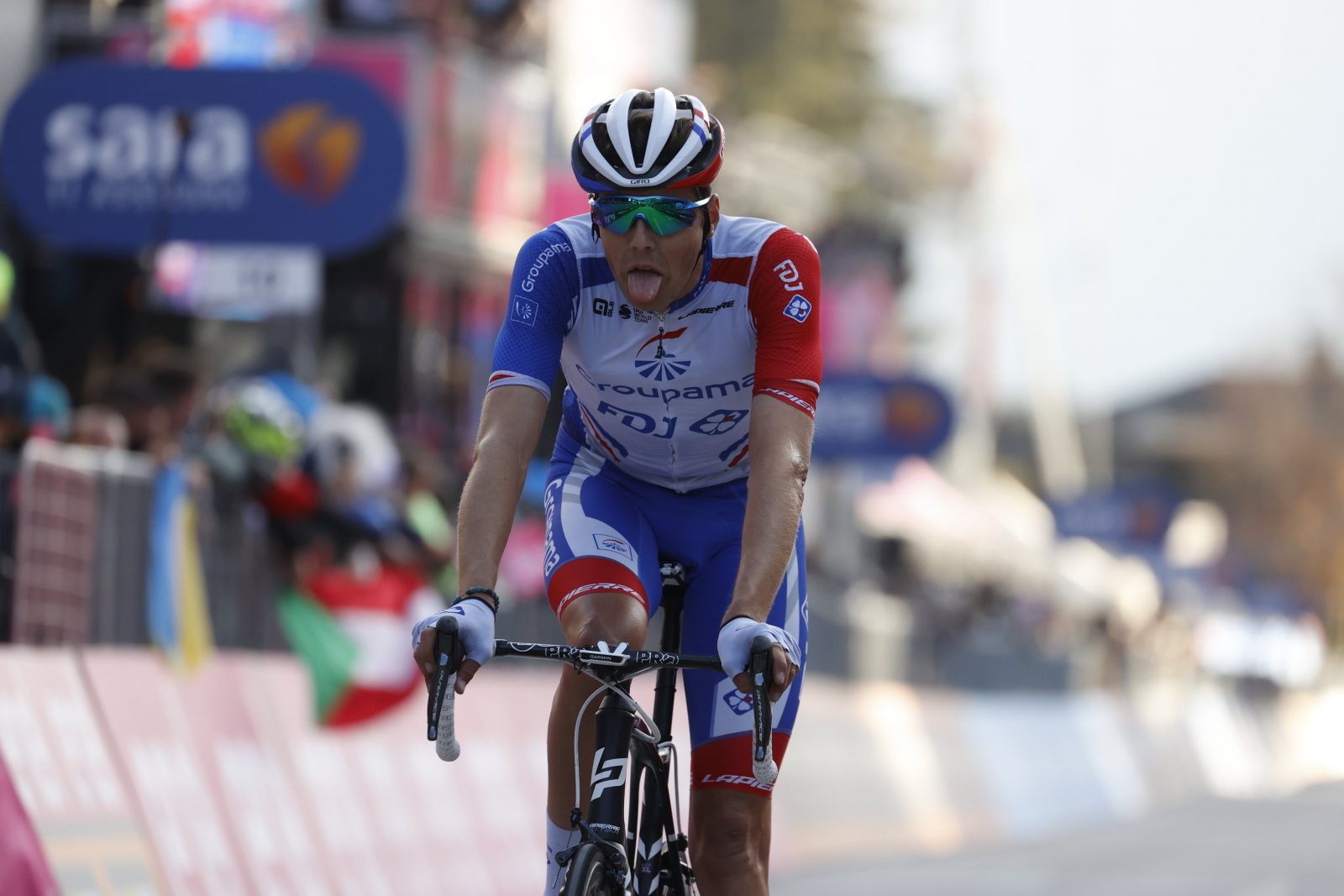 Entre Bassano del Grappa et la Madonna di Campiglio, 200 kilomètres et trois grands cols composaient la première très grande étape de montagne du Giro, ce mercredi. Le menu particulièrement corsé n’a pourtant pas freiné les ardeurs des audacieux sur les coups de 10h30. La bataille pour l’échappée a ainsi été particulièrement rude durant la première heure de course, entièrement disputée sur le plat. Il a ainsi fallu attendre le premier col du jour, le Passo Durone (21 km à 6,7%) pour qu’un groupe parvienne à se détacher devant le peloton. Parmi les attaquants figurait alors le Suisse de l’Équipe Groupama-FDJ, Kilian Frankiny. « C’est la deuxième fois que j’avais carte blanche sur ce Giro, et je voulais saisir cette chance, expliquait le grimpeur helvète. Je voulais vraiment être dans l’échappée et j’ai donc donné mon maximum pour y arriver ». « Ça n’a pas été facile, rappelait Benoit Vaugrenard. C’est sorti en costaud dans la première ascension ». Car si dix-neuf coureurs ont dans un premier temps réussi à ouvrir une brèche, le peloton ne s’est pas immédiatement décidé à laisser partir, et il a donc fallu lutter pendant de longues minutes pour gagner sa présence à l’avant. Ce n’est que lorsque le peloton s’est réduit à une quarantaine d’unités que la formation Deceuninck-Quick Step a stoppé la poursuite, permettant donc à l’échappée du jour de se développer.