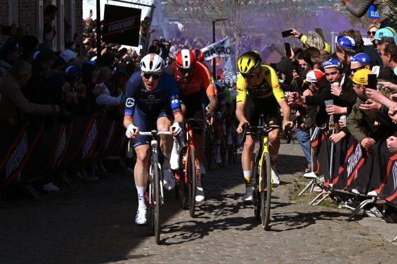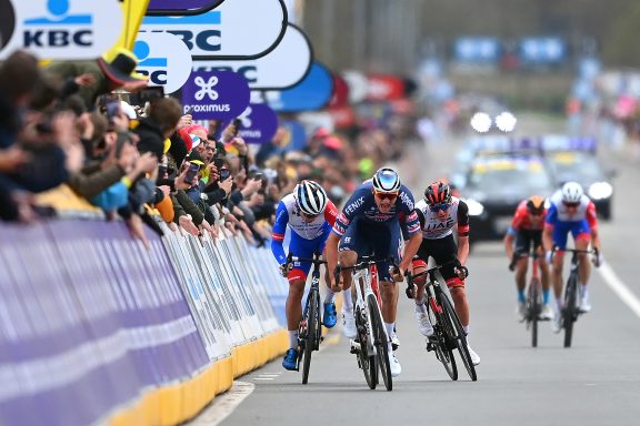 Si Paris-Roubaix sonnera la fin des Classiques pavées dimanche prochain, la séquence dite des « Flandriennes » arrivait elle à son terme dès ce dimanche de Pâques avec la plus belle, la plus grande, et la plus historique de toutes. Entre Anvers et Audenarde, dans un serpentin savamment dessiné sur 270 kilomètres, le Tour des Flandres 108ème du nom concentrait ainsi toutes les aspirations des coureurs et la passion du public. Pour dompter ce deuxième Monument de la saison, il fallait notamment franchir dix-sept monts, dont trois fois le Vieux Quaremont, deux fois le Paterberg, mais aussi l’effroyable Koppenberg, ainsi que sept secteurs pavés. Les difficultés n’étaient attendues qu’à partir de la mi-course, et c’est une échappée de huit incluant Bert Van Lerberghe, Luke Durbridge, Elmar Reinders, Damien Touzé, Lionel Taminiaux, Stanislaw Aniolkowski, David Dekker et Jelle Vermoote qui a d’abord mené les débats avec quatre minutes d’avance. Dans les premiers monts, et particulièrement dans leur approche, la tension s’est grandement accrue dans le peloton, les premières cassures sont intervenues, et les premiers mouvements se sont initiés. Laurence Pithie s’est montré particulièrement attentif et a suivi quelques accélérations au sommet du Molenberg. Mais peu avant le Berendries, un solide groupe d’attaquants notamment composé de Mads Pedersen, Dylan Van Baarle, Tiesj Benoot ou Nils Politt a contraint le reste du peloton à une belle course-poursuite.