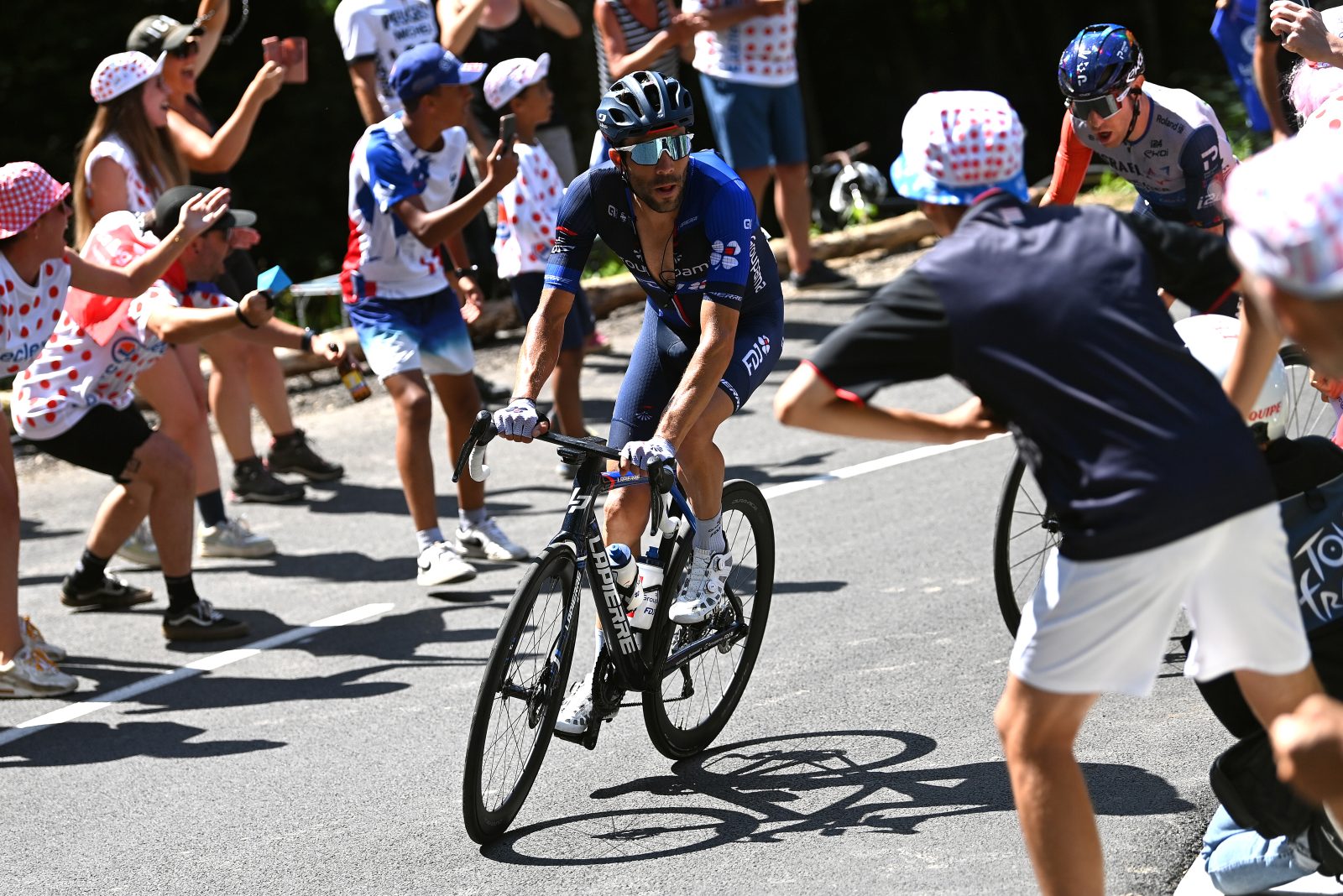 Pour la première fois depuis le départ du Tour, les coureurs s’engageaient ce samedi dans une étape cumulant plus de 4000 mètres de dénivelé. Sur les 151 kilomètres menant à Morzine, cinq ascensions étaient répertoriées, dont trois de première catégorie et une Hors Catégorie : le Col de Joux Plane (11,7 km à 8,5%), franchi à treize kilomètres du but. Mais le départ, très accidenté, a également eu son influence. Le coup d’envoi de l’étape a d’ailleurs été donné à deux reprises, puisqu’une chute massive dans les cinq premiers kilomètres a interrompu la course pendant une trentaine de minutes. « On sentait qu’il y avait beaucoup de nervosité et de tension, qui plus est après la petite averse du départ, expliquait Thibaut Pinot. Il y a eu cette grosse chute, puis tout le monde voulait être dans l’échappée. C’était un début d’étape sous tension ». Dans la première bosse de 1ère catégorie, le Col de Cou, le grimpeur haut-saônois s’est justement fendu d’une offensive pour rejoindre le groupe de tête et tenter de prendre le large. Cela n’aura jamais été le cas. Thibaut Pinot et quelques autres ont eu beau relancer à plusieurs reprises, le peloton mené par la Jumbo-Visma du maillot jaune Jonas Vingegaard ne leur a jamais concédé plus d’une quarantaine de secondes d’avance. « J’ai d’abord voulu réduire le groupe car il n’y avait pas une bonne entente, mais c’était vraiment dur dans la tête de voir que tout le train Jumbo-Visma roulait derrière », expliquait Thibaut.