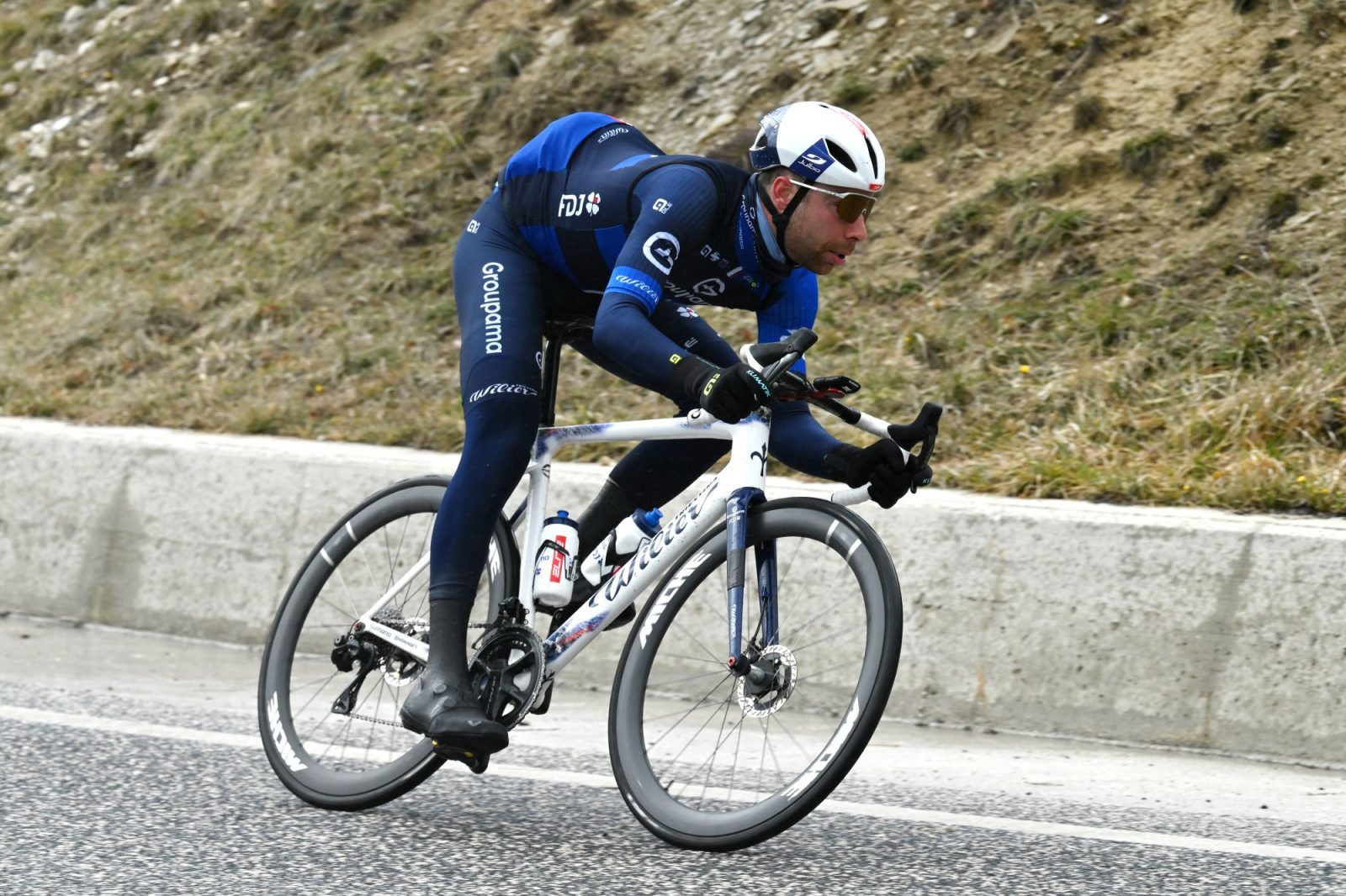 Les sprinteurs espéraient bien avoir gain de cause ce jeudi, mais avant de plonger sur Trasacco, près de 2500 mètres de dénivelé était à gravir dans les cent premiers kilomètres du parcours. Trois ascensions, loin d’être insignifiantes, se dressaient face aux coureurs, et l’action n’a pas manqué au départ. L’échappée ne s’est d’ailleurs dessinée qu’après une quarantaine de kilomètres, autour de cinq hommes. Le peloton s’est d’abord complètement relevé en leur accordant six minutes d’avance, puis une véritable accélération est intervenue dans la montée de Valico La Crocetta (12 km à 6%) à la mi-course. Cela a eu pour conséquence de distancer quelques sprinteurs, de ramener l’écart à moins de deux minutes, mais la course a encore davantage explosé avant la longue descente. « On a eu exactement le scénario qu’on avait envisagé, expliquait Thierry. En haut de la dernière difficulté, on était sur un plateau bien dégagé, avec le vent de côté. On savait qu’il y avait un gros risque que ça roule vite, que ce soit pour le général ou pour éliminer des sprinteurs, et donc que c’était un terrain à bordures. Ça a effectivement mis le bazar et c’était parti ».