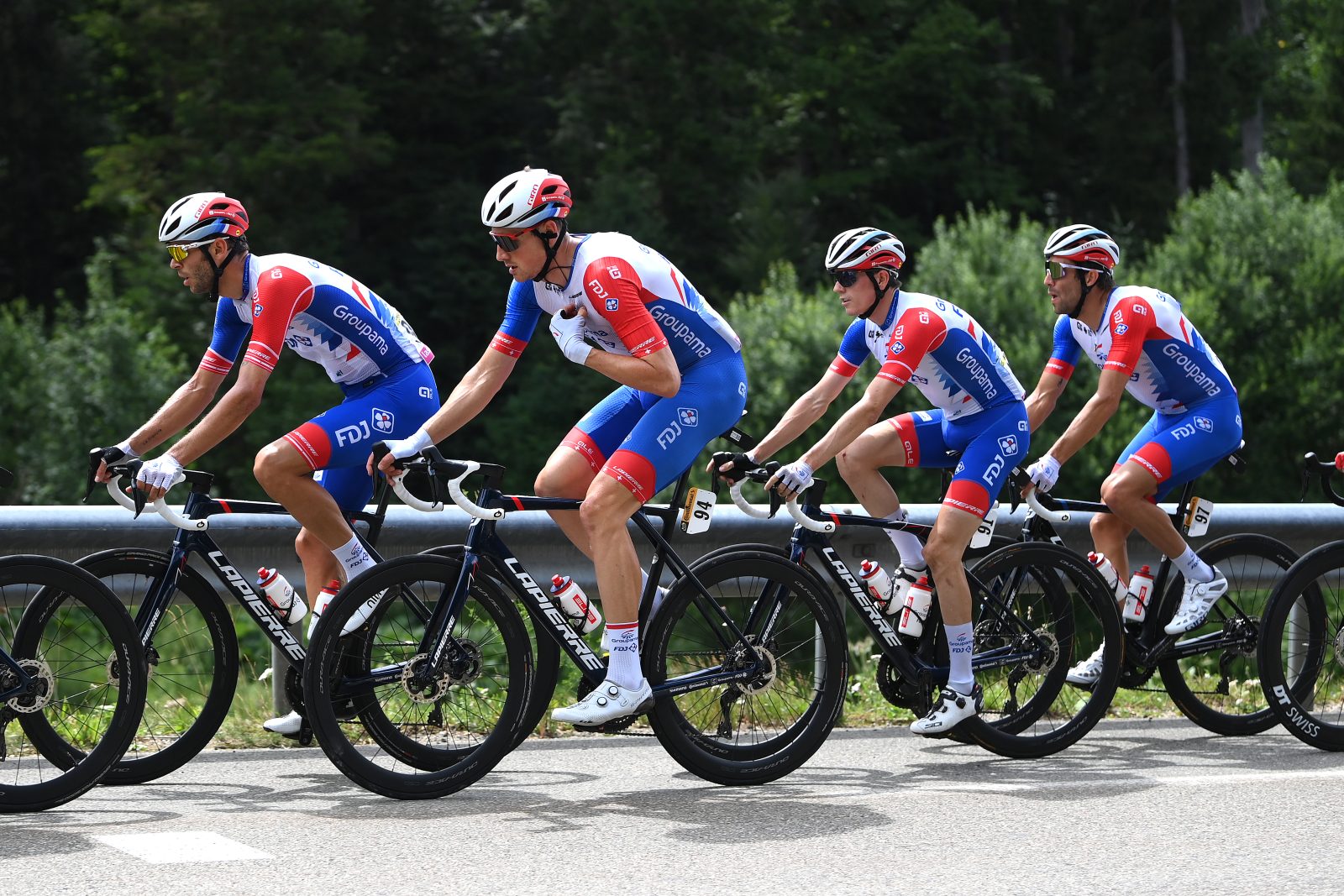 En direction de Lausanne ce samedi, l’Équipe cycliste Groupama-FDJ a vécu une huitième étape du Tour de France presque tranquille. Une chute massive en début de course a d’abord retardé David Gaudu parmi d’autres, puis Thibaut Pinot a vécu une double infortune à cinquante kilomètres de l’arrivée, mais rien de grave au bout du compte. Le leader breton a finalement parfaitement accompagné les meilleurs dans l’arrivée punchy du jour et demeure cinquième du général avant les premiers massifs alpestres de dimanche.