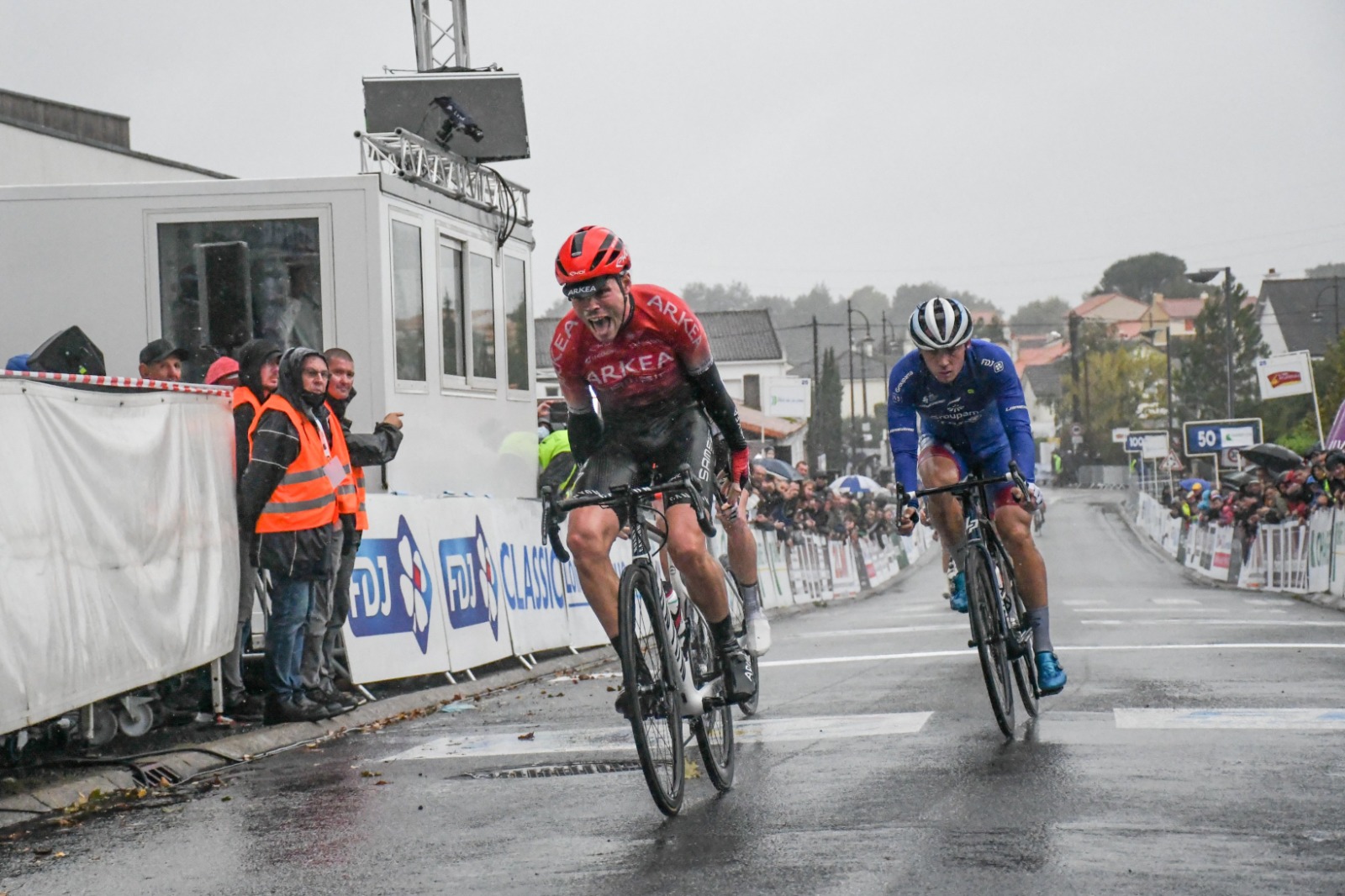 En se dirigeant 150 kilomètres plus au sud, en direction de La Haye-Fouassière, le groupe de Thierry Bricaud espérait sans doute connaître des conditions plus clémentes qu’à Vitré, ce samedi. Il n’en a rien été. Dès le départ de la Classic Loire Atlantique, la pluie a fait son apparition sur le parcours, et le vent s’est également invité à la fête. Malgré une météo pour le moins capricieuse, la Groupama-FDJ avait un objectif clair ce matin : corriger sa prestation de la veille. « Il fallait se remettre en question, tout simplement, indiquait Thierry. Le vrai problème est que nous avons eu des conditions climatiques apocalyptiques ces deux derniers jours. Or, quand tu n’es pas impliqué à 100%, tu sors rapidement de la course et tu n’es de fait pas acteur. On devait se remettre dans le match ». Le message est visiblement bien passé puisqu’au terme du premier des onze tours (16,8 km) du circuit, Valentin Madouas et Tobias Ludvigsson sont parvenus à se glisser dans une échappée de quatorze coureurs. Un vrai mano a mano s’est alors installé avec les équipes piégées dans le peloton, et l’écart a longtemps oscillé entre quarante-cinq secondes et une minute.