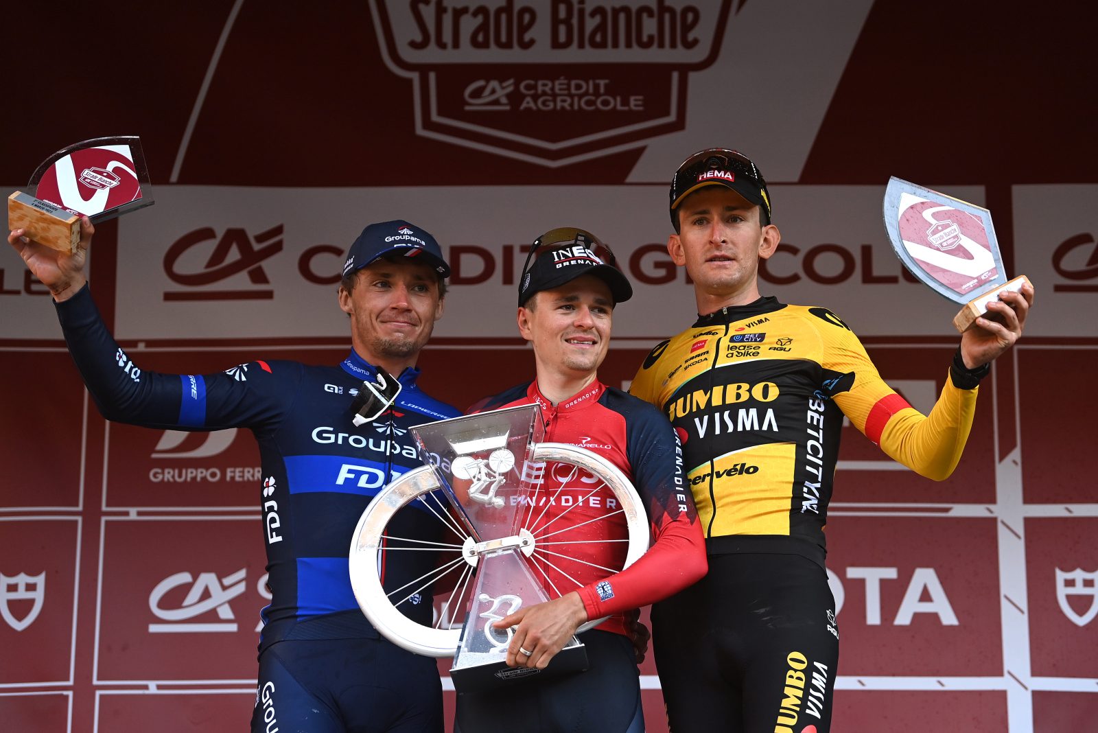 Malgré la poussière toscane, l’Équipe cycliste Groupama-FDJ n’est pas passée inaperçue ce samedi après-midi, lors des Strade Bianche. En particulier, Valentin Madouas et Romain Grégoire ont livré un superbe final au contact des favoris, après avoir répondu présents lorsque tout s’est emballé à cinquante kilomètres de l’arrivée. Le puncheur breton a même bataillé pour le podium jusqu’à l’approche de Sienne, et s’est d’ailleurs montré le plus fort parmi les poursuivants de Thomas Pidcock, vainqueur. Sur la Piazza del Campo, Valentin Madouas a ainsi signé un nouveau podium dans une Classique WorldTour (2e), après sa troisième place obtenue sur le Ronde l’an passé. Romain Grégoire a parachevé l’excellente journée de l’équipe en prenant place dans le top-10 (8e), pour sa première participation, à tout juste 20 ans.