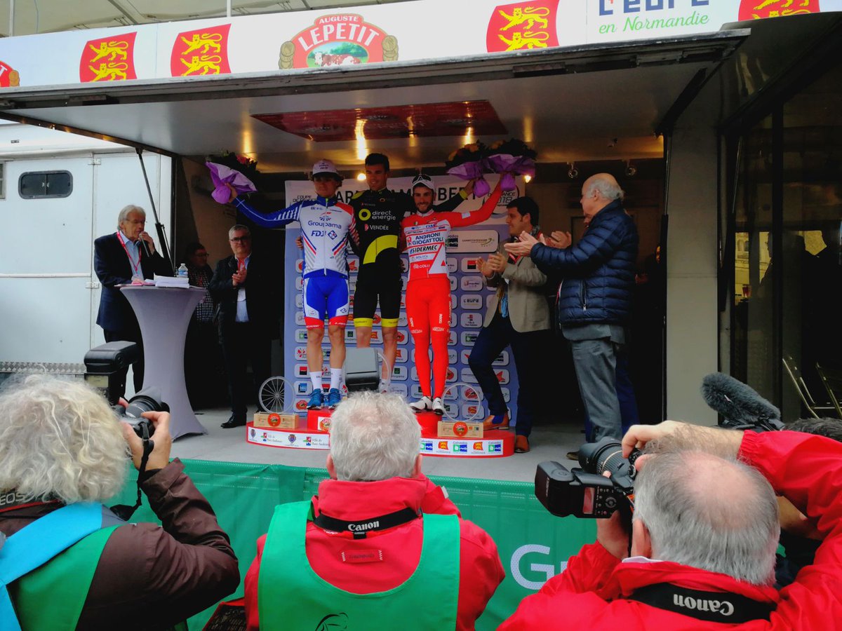 La semi-classique normande proposait un final bien corsé et c’est la raison pour laquelle, sans doute, trois coureurs seulement se sont lancés dans une longue échappée. Quemeneur (Direct Energie), Gouault (Roubaix-Lille Métropole) et Eaton (United Healthcare) ont compté plus de six minutes d’avance à la lisière de la deuxième heure mais la poursuite engagée par trois équipes leur a été fatale après l’escalade de la côte de Moulin-Neuf.