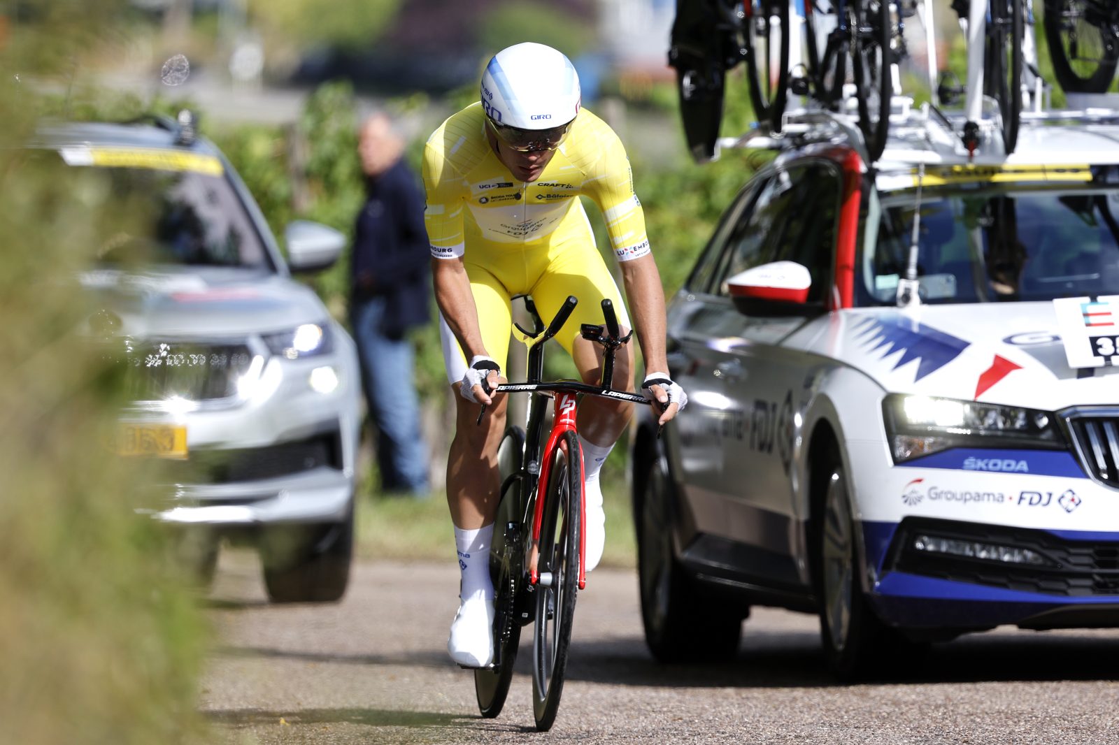 Kévin Vauquelin (Arkéa-Samsic) a d’abord pris la tête, avant d’être devancé par Mattias Skjelmose (Trek-Segafredo). Du côté de l’Équipe cycliste Groupama-FDJ, Kevin Geniets s’est arraché sur ses terres et a coupé la ligne avec le quatrième temps provisoire, avant de rétrograder au sixième rang, à vingt-cinq secondes. Une vingtaine de minutes plus tard, c’est Valentin Madouas, paré de son maillot jaune, qui en a terminé. En retard de dix-huit secondes à l’intermédiaire par rapport au Danois, le Breton en a concédé vingt supplémentaires dans la deuxième partie mais a malgré tout établi le dixième chrono de la journée. Cela n’a toutefois pas été suffisant pour rester aux commandes du général, également propriété de Skjelmose. « Les gars ont fait leur maximum, assurait Frédéric. On savait que ça allait être compliqué de garder le maillot face à des spécialistes, mais on espérait quand même car le parcours aurait pu être pire, et on avait dix-huit secondes sur un bon nombre de concurrents. Ceci étant, on n’a pas de regrets. On est à notre place. Ce n’est pas non plus évident quand tu n’as pas l’habitude de faire tous les chronos à bloc, mais c’est de l’expérience engrangée ». « Je suis quand même satisfait, j’ai fait un bon chrono, jugeait Valentin. J’avais dit qu’il me fallait quarante secondes, je termine à trente-huit. Il m’en manque un petit peu, mais les jambes étaient bonnes et je n’ai pas de regrets. C’est comme ça, ce n’est pas très grave, il reste encore une étape demain ».