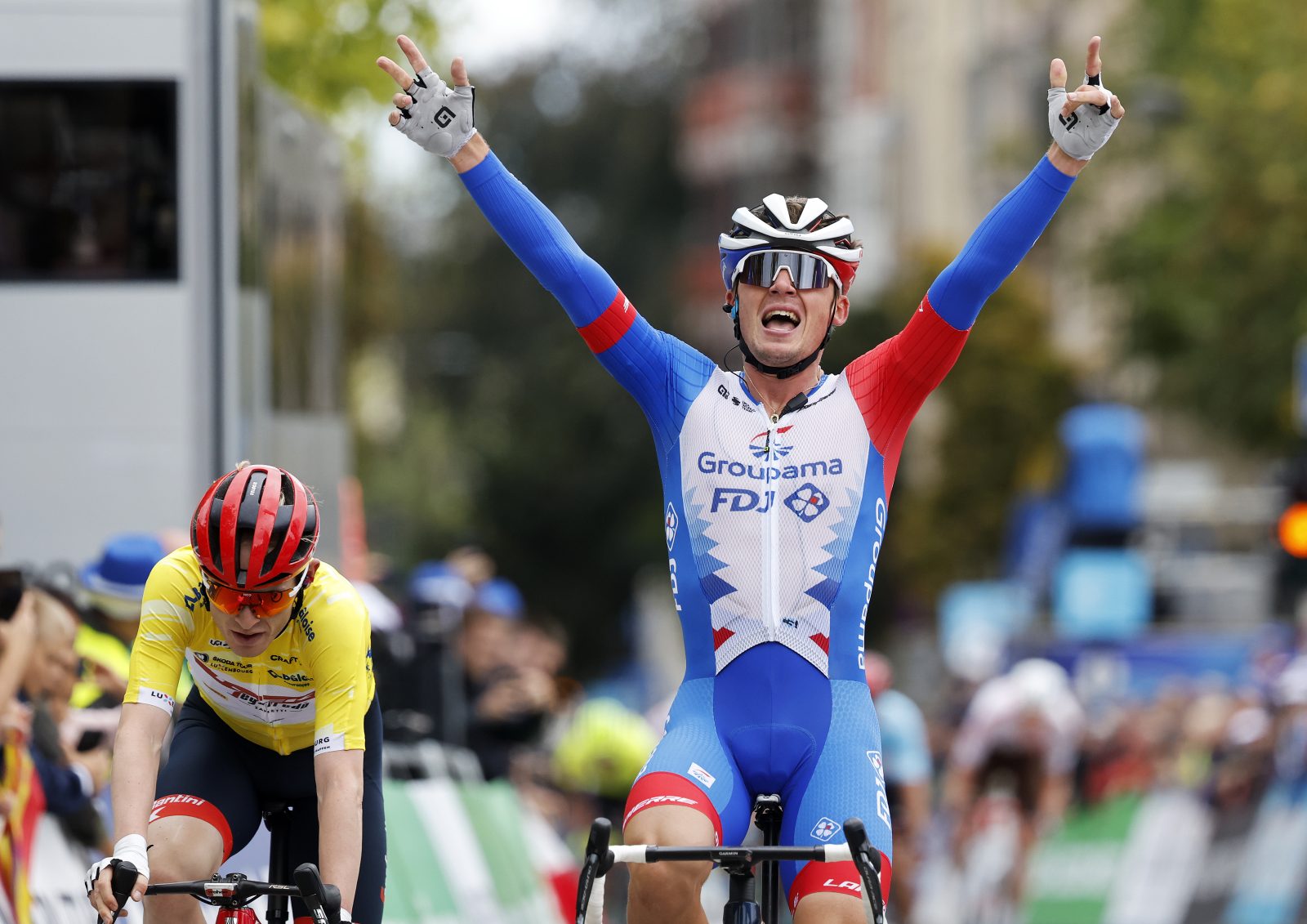 Lars van den Berg a dès lors navigué une quinzaine de secondes devant le peloton pendant quelques kilomètres avant de retrouver sa place parmi ses coéquipiers et d’imprimer un solide tempo. Néanmoins, la sélection n’a été que très relative sur le petit circuit de onze kilomètres autour de Luxembourg. « Finalement, la course s’est décantée sur le tard et ça a pratiquement été une course de côte, affirmait Frédéric. On aurait peut-être pu profiter un peu plus de notre supériorité numérique avec Kevin et Val si ça s’était durci un peu avant, mais ça n’a pas été le cas ». « Les gars étaient super et on a pu faire une belle course d’équipe, assurait Valentin. On voulait durcir dans le final, mais le circuit n’était pas assez compliqué et il y avait surtout un vent de face dans la deuxième montée qui bloquait un peu la course. On a donc préféré attendre et tout miser sur la victoire d’étape, en espérant faire une différence dans la dernière montée ». « On pouvait simplement espérer que le leader craque, ajoutait Frédéric. Il était en tout cas important que Valentin et Kevin soient vraiment placés au pied pour ne pas avoir un temps de retard. Il fallait vraiment qu’on soit dans le coup dès le pied de la bosse et qu’on tente le tout pour le tout. On savait qu’ils ne se seraient pas couchés dans ce genre d’ascension compte tenu de leur forme du moment ». Une soixantaine d’hommes sont alors partis à l’abordage du Pabeierbierg (700 m à 9%), et Valentin Madouas est sorti de sa réserve après quelques secondes. Le Breton a produit une longue accélération à laquelle seuls trois hommes ont pu répondre : son acolyte Kevin Geniets, Kevin Vauquelin et le maillot jaune Mattias Skjelmose. Au sommet, le quatuor a pu prendre quelques longueurs d’avance sur le reste de la concurrence, et le Breton a gardé les rênes jusqu’au dernier virage. « J’ai ensuite laissé un petit écart à 300 mètres de la ligne sur le maillot jaune, afin de faire un petit sprint décollé compte tenu du vent de face, commentait Valentin. Je suis arrivé avec un peu de vitesse, ce qui m’a permis de le doubler, et avec le vent de face, on est ensuite tous restés à notre place ».