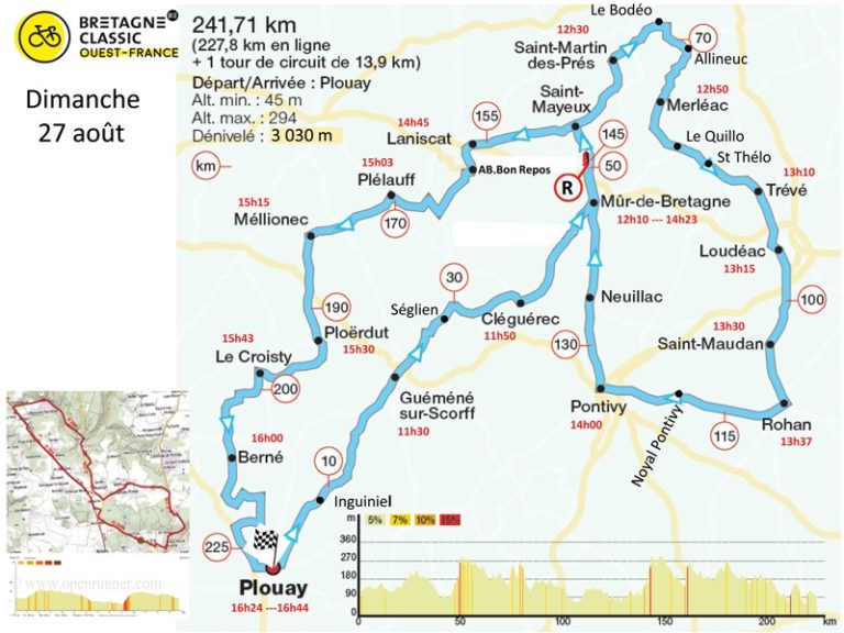 La partie en ligne de la Bretagne Classic Ouest-France s’étirera sur 227.8 km plus un tour de circuit de 13.9 km soit 241.7 km au total.
