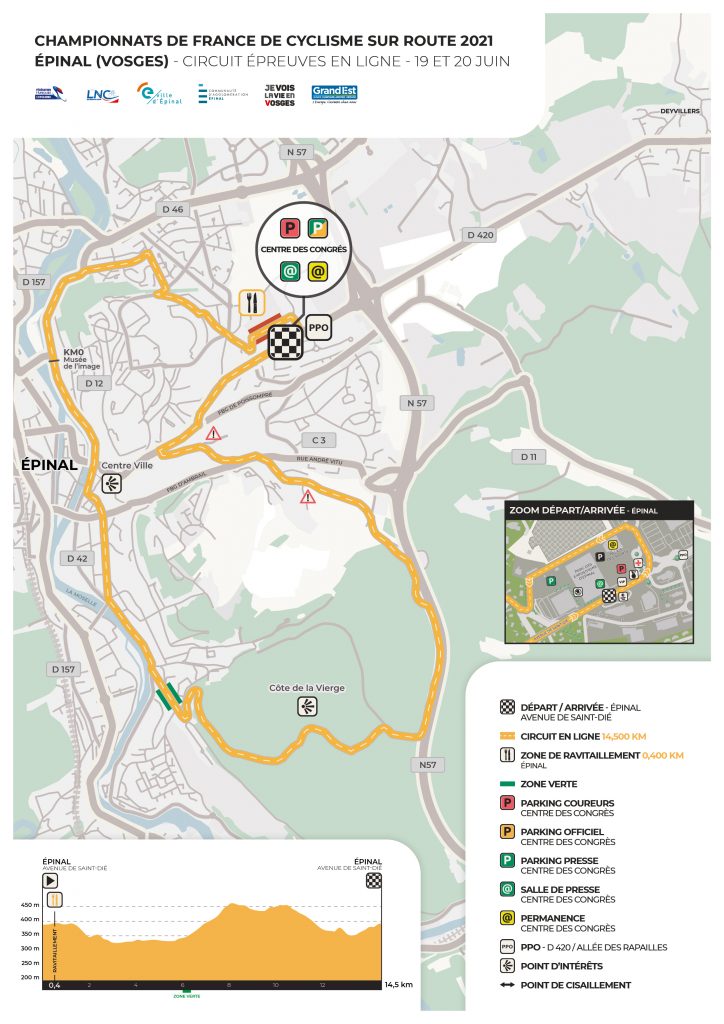 110 ème édition des Championnats de France de cyclisme sur route, cette édition 2021 se déroulera sur une boucle de 14.5 km dans la ville d’Epinal. Au final 16 tours seront effectués pour un total de 242.9km.