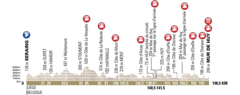 C’est à partir du kilomètre 127 que la course va se corser avec la première vraie côte répertoriée. L’enchaînement Mur de Huy – Côte D’Ereffe (2,1km à 5%) – Côte de Cherave (1,3km à 8,%) par deux fois, avant l’ultime ascension du fameux Mur de Huy (9,6% de pente en moyenne) devrait faire le tri chez les favoris avant de joindre l’arrivée.
