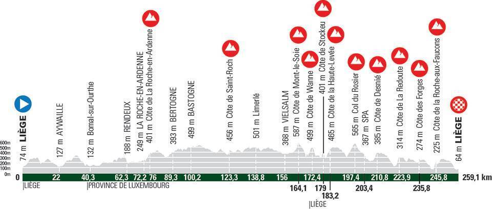 L’itinéraire de course traverse le massif de l’Ardenne et ses célèbres monts dont l’emblématique côte de La Redoute avec ses passages à plus de 20%. Cette édition 2021 se terminera par une dernière ascension à la côte de la Roche-aux-Faucons avant l’arrivée à Liège.
