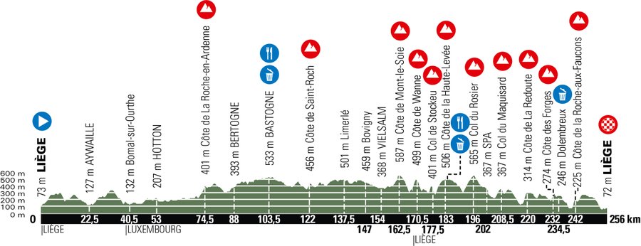 L’itinéraire de course traverse le massif de l’Ardenne et ses célèbres monts dont l’emblématique côte de La Redoute avec ses passages à plus de 20%. Cette édition 2020 se terminera par une dernière ascension à la côte de la Roche-aux-Faucons avant l’arrivée à Liège.