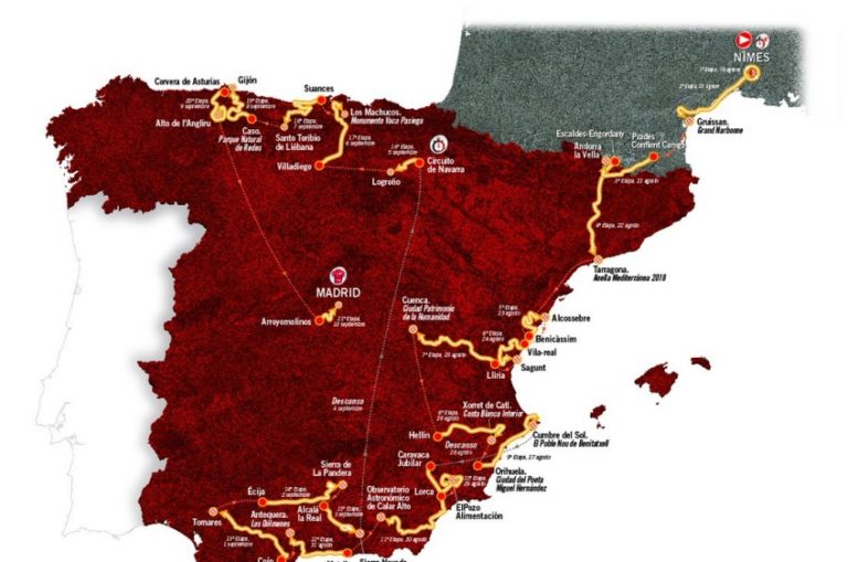 Pour la troisième fois de son histoire, la Vuelta démarrera à l’étranger. Et c’est en France, dans la ville de Nîmes, que la compétition débutera. Elle sera composée au total de: 5 étapes de plaine et 1 étape de plaine avec une arrivée au sommet, 8 étapes de moyenne-montagne, 5 étapes de montagne, 1 étape contre-la-montre par équipe, 1 étape contre-la-montre individuel.