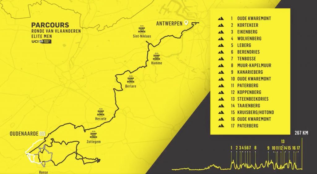 Au programme de cette édition 2020, 267 kilomètres seront à parcourir entre Anvers et Audenarde avec plus de 17 monts dont une bonne partie durant les 50 derniers kilomètres.
