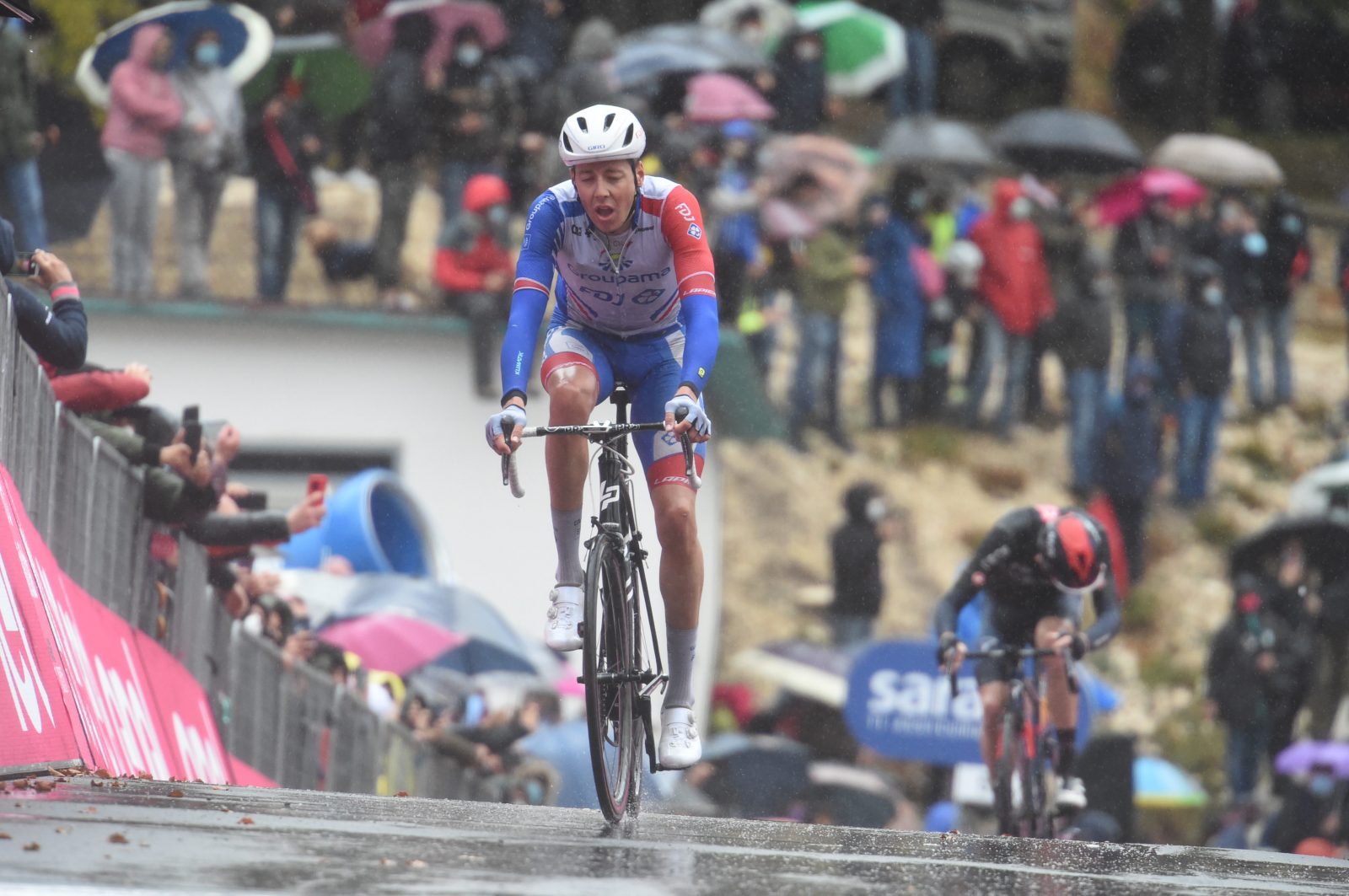 In the lead, the Groupama-FDJ’s rider first found himself with Larry Warbasse (AG2R-La Mondiale), Ruben Guerreiro (EF Pro Cycling), Eduardo Sepulveda (Movistar), Ben O’Connor (NTT), Jonathan Castroviejo (Ineos) and Giovanni Visconti (Vini Zabù-KTM), before Mikkel Bjerg (UAE Team Emirates) also joined the break. “Castroviejo was only six minutes behind the pink jersey on GC so he was a bit of a problem,” Kilian added. “Deceuninck-Quick Step never gave us more than six minutes. At first, I thought we couldn’t make it to the end. When our lead narrowed to four minutes, I even thought it was dead, but it then it stabilized and I believed we could make it with ten kilometers to go.” At this point, and after some rain showers and cold temperatures, the breakaway was only made of five men. Few minutes later, Castroviejo (“the strongest in the break” according to Kilian Frankiny) made the decisive move. “I was in front when he attacked, I had just finished my turn,” explained the Swiss. “I couldn’t follow. I then gave my maximum until the end, especially in the very steep finish, and I was able to drop Warbasse 10 meters before the line”. The young climber took fourth place on the day, which is his best career result in such an event. “I’m happy with my stage,” he assured. “It was the first time that I fought for victory in a Grand Tour, and it was a great feeling. When we started the last climb, I almost couldn’t believe I was playing for the win. I now know the condition is good. There are twelve stages left, some in the mountains, and I hope to have my chance again”.
