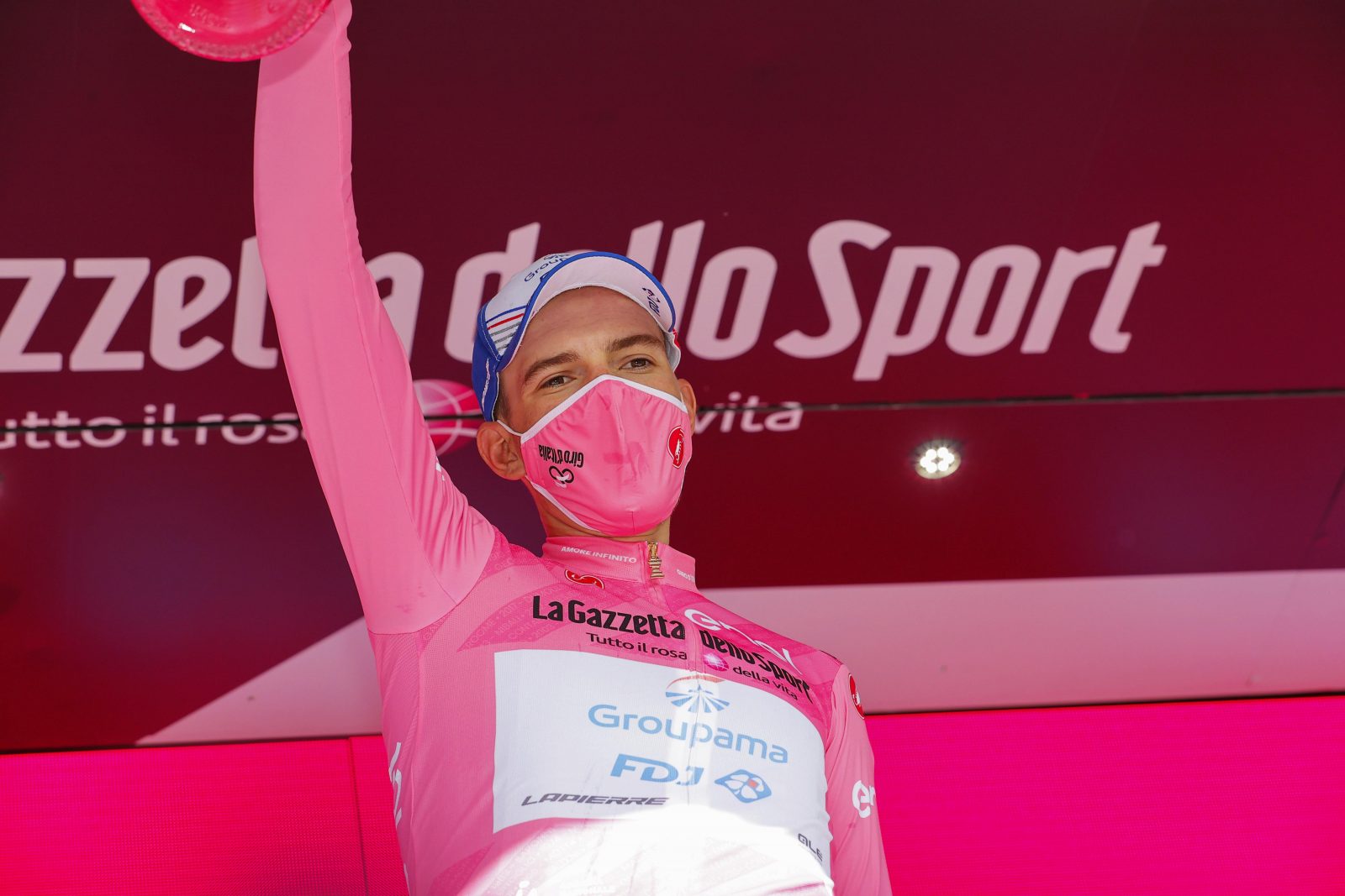 At the bottom of the last climb (15k at 6%), the group of favourites therefore only included one rider higher than Attila Valter in the general classification: Louis Vervaeke (18 seconds ahead). The group progressively reduced from the back, but the Hungarian from Groupama-FDJ only started to move upper and upper in the bunch. Serious things started in the last four kilometers, as Gino Mäder set off for the stage victory while Attila Valter was still in contact with the very best. He was even among the quickest to react to Egan Bernal’s acceleration 1,500 meters from the finish. Under the red flame, the white jersey made quite an impression being there next to the favourites of this 2021 Giro. He certainly dropped back a little in the final hundred meters, but he still crossed the line only sixteen seconds behind Bernal, Evenepoel or Dan Martin. In the meantime, Louis Vervaeke was losing much more time, and the news came quite quickly. Moments after crossing the line in 12th position, Attila Valter was called to the official podium. Not just to pick up his white jersey, which he managed to retain, but above all to take the pink jersey, which he had just conquered with style at the end of an epic day of racing.